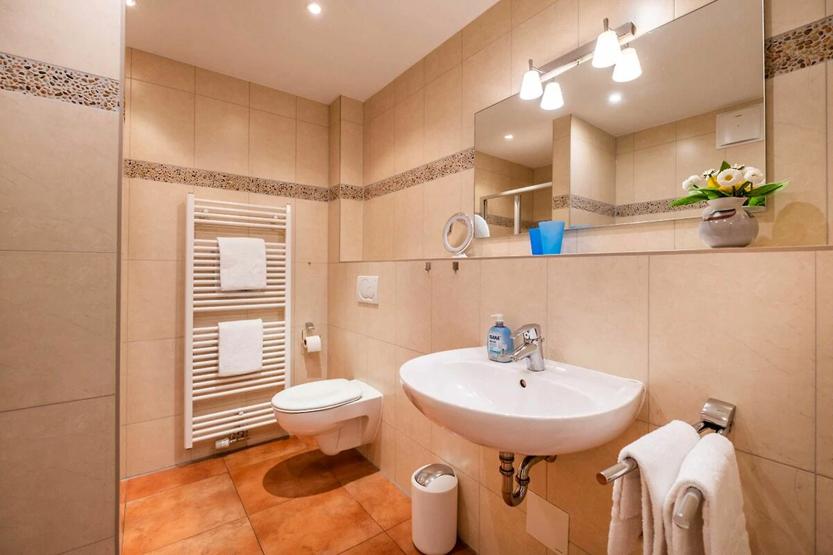 Sanitär: Duschbad mit ebenerdiger Dusche, Haar-Föhn, Kosmetikspiegel
