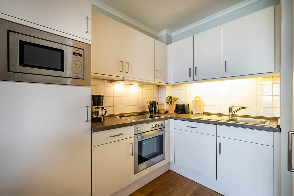 Das Appartement 2.3 mit Balkon liegt im zweiten Obergeschoss des Hauses Hafenresidenz. Im Wohnzimmer finden Sie eine gemütliche Couchgarnitur mit einen Fernsehsessel vor. Die Küche und der Essbereich sind im Wohnbereich integriert. Das Schlafzimmer ist mit einen Doppelbett und TV-Wandmontage ausgestattet. Die Lattenroste des Bettes sind elektrisch verstellbar. Das geräumige Duschbad verfügt über einen Handtuchtrockner, Haltegriffe am WC und in der Dusche. Die Dusche hat eine kleine Einstiegskante. Fußbodenheizung im ganzen Appartement. Vom Wohnzimmer gelangen Sie auf den Balkon, der in Südwestlage liegt. Das Appartement verfügt über elektrische Außenjalousien und über eine Gegensprechanlage mit Kamera. Im Erdgeschoß des Hauses finden Sie Waschmaschine und Trockner (gebührenpflichtig) und einen Abstellraum für Fahrräder. Das Haus verfügt über einen Aufzug.