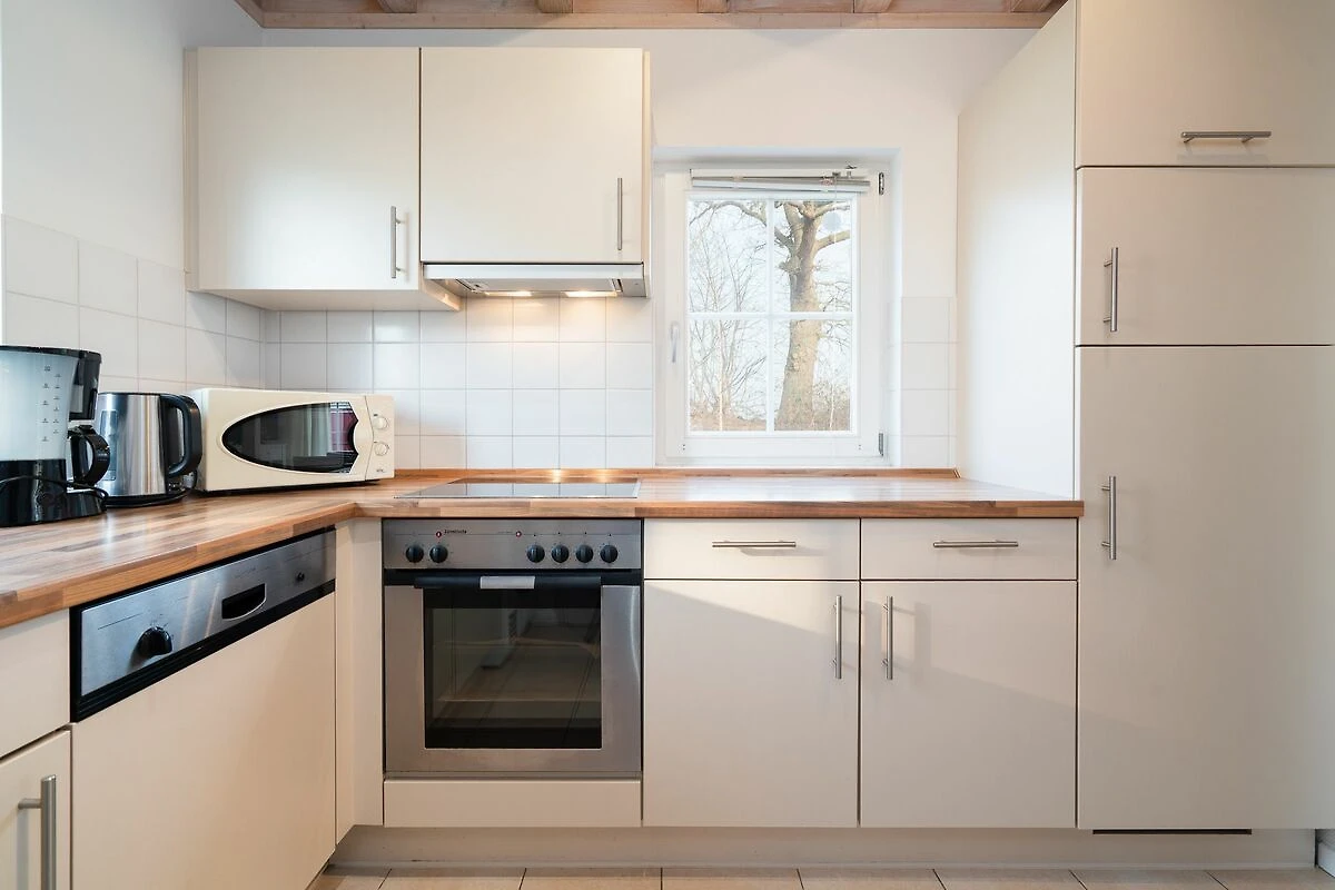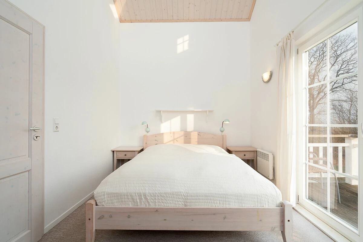 Der gemütliche Wohn- und Essbereich mit Kamin und die offene Küche mit Spülmaschine, Backofen, Herd und Waschmaschine befinden sich im Erdgeschoss. Hier ist auch die Sauna mit Dusche und WC untergebracht. Der Komfort einer eigenen Sauna wird sehr von unseren Wintergästen geschätzt. Vom Wohn- und Essbereich aus haben Sie Zugang zur Terrasse. In der ersten Etage sind 2 Schlafräume mit Doppelbetten (jeweils 2x 80 cm x 200 cm), einer sogar mit Balkon und Meerblick, sowie das Bad mit WC und Whirlwanne. Einen 3.Schlafbereich mit zwei Einzelbetten (2x 80 cm x 200cm) findet man in der 2.Etage in einer offenen Schlafgalerie unterm Dach. Von hier aus können Sie auch seitlich in die Neustädter Bucht schauen. Die Beheizung des Hauses erfolgt über Elektroheizungen und den Kamin.