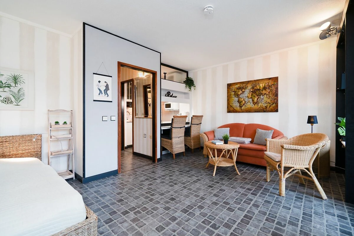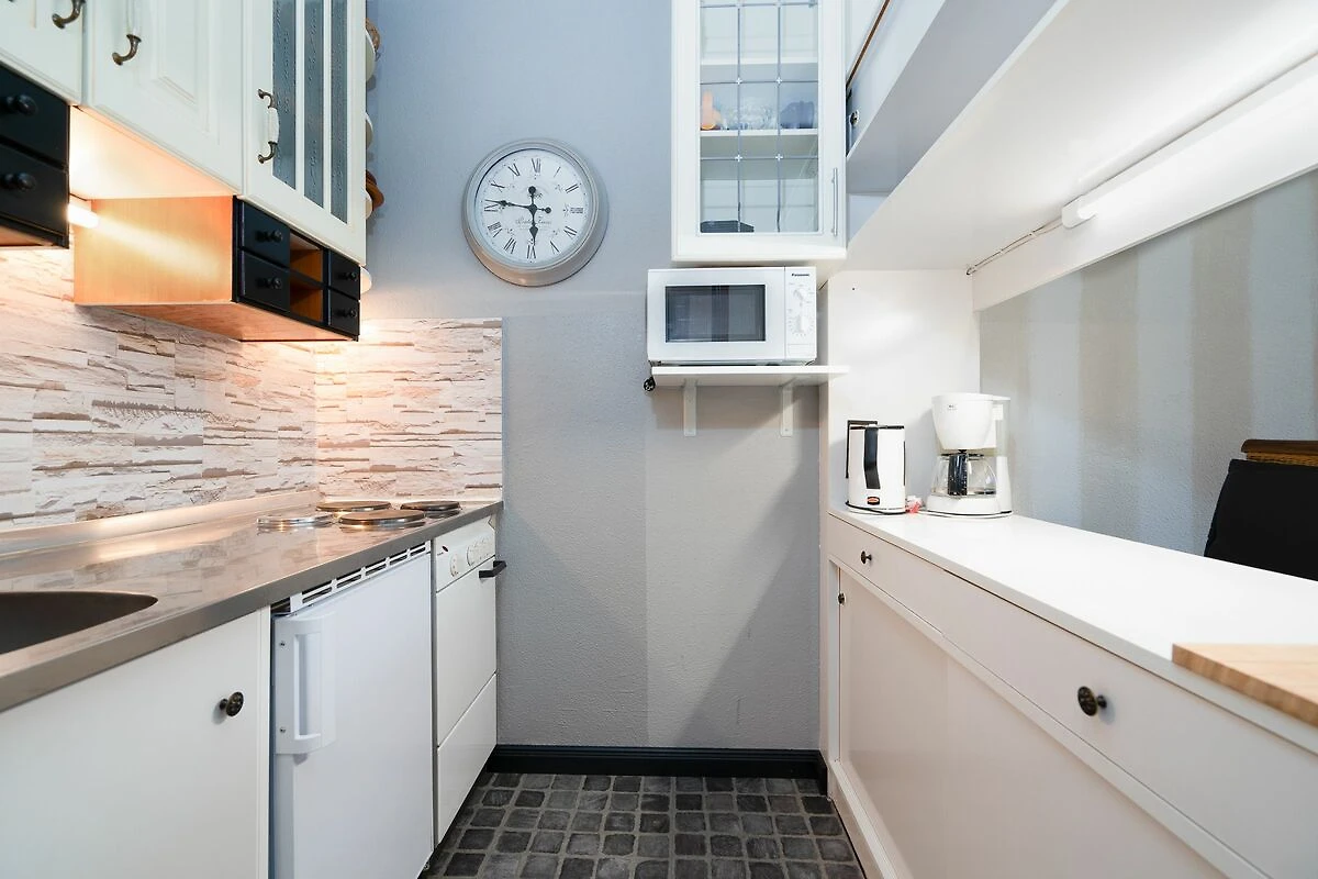 diese 1-Raum-Nichtraucher-Ferienwohnung liegt in der Apartmentanlage Ferienpark in der 2. Etage mit einem möblierten Nord-West-Balkon ohne Meerblick. Die Wohnung ist ca. 33 qm groß und für 2 Personen (+ Kleinkind) geeignet. Im kombinierten Wohn- und Schlafraum finden Sie ein Doppelbett (140 cm x 200 cm), in das man seitlich einsteigen kann. Die kleine Küchenzeile hat eine Durchreiche zum Wohnbereich und ist mit Backofen und Herd ausgestattet. Das Duschbad ist modernisiert und innenliegend. Zum Strand und zur Promenade sind es nur wenige Gehminuten. PKW-Stellplatz inklusive.