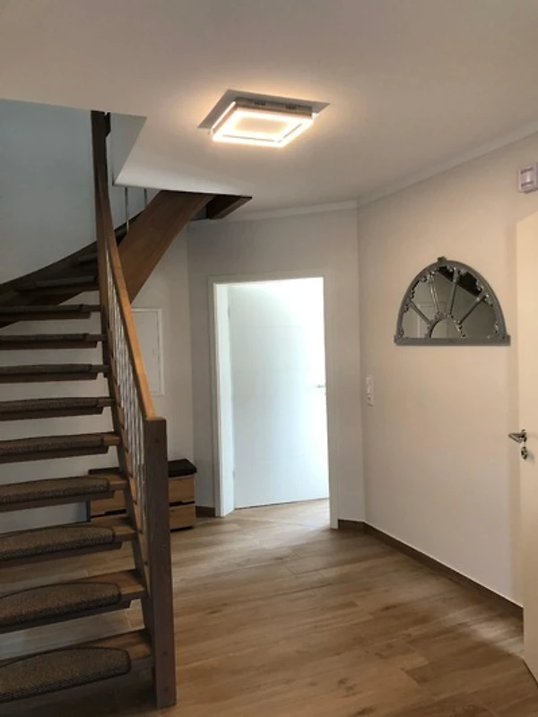 Alle Schlafräume und der Flur im Obergeschoss sind mit Echtholz-Fussboden ausgestattet. Wohn- und Essbereich, sowie Flur sind mit modernen, pflegeleichten Fliesen in Holzoptik ausgestattet. Das Bad besticht durch den anthrazit-farbigen Boden und die hellen Wände.
