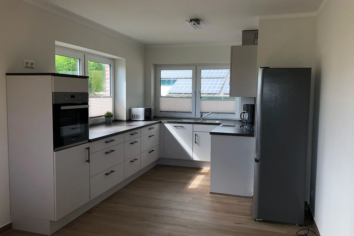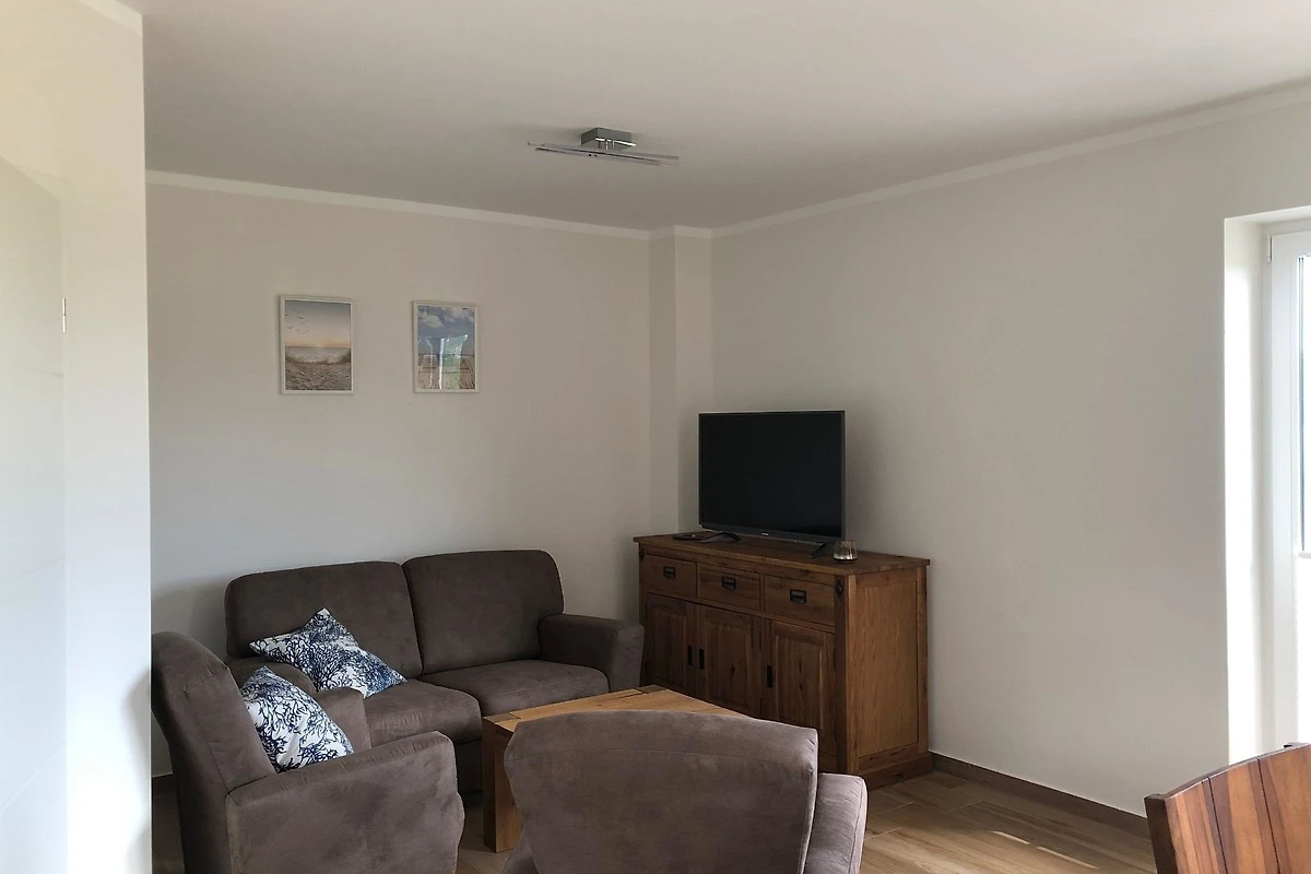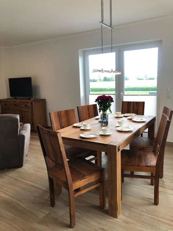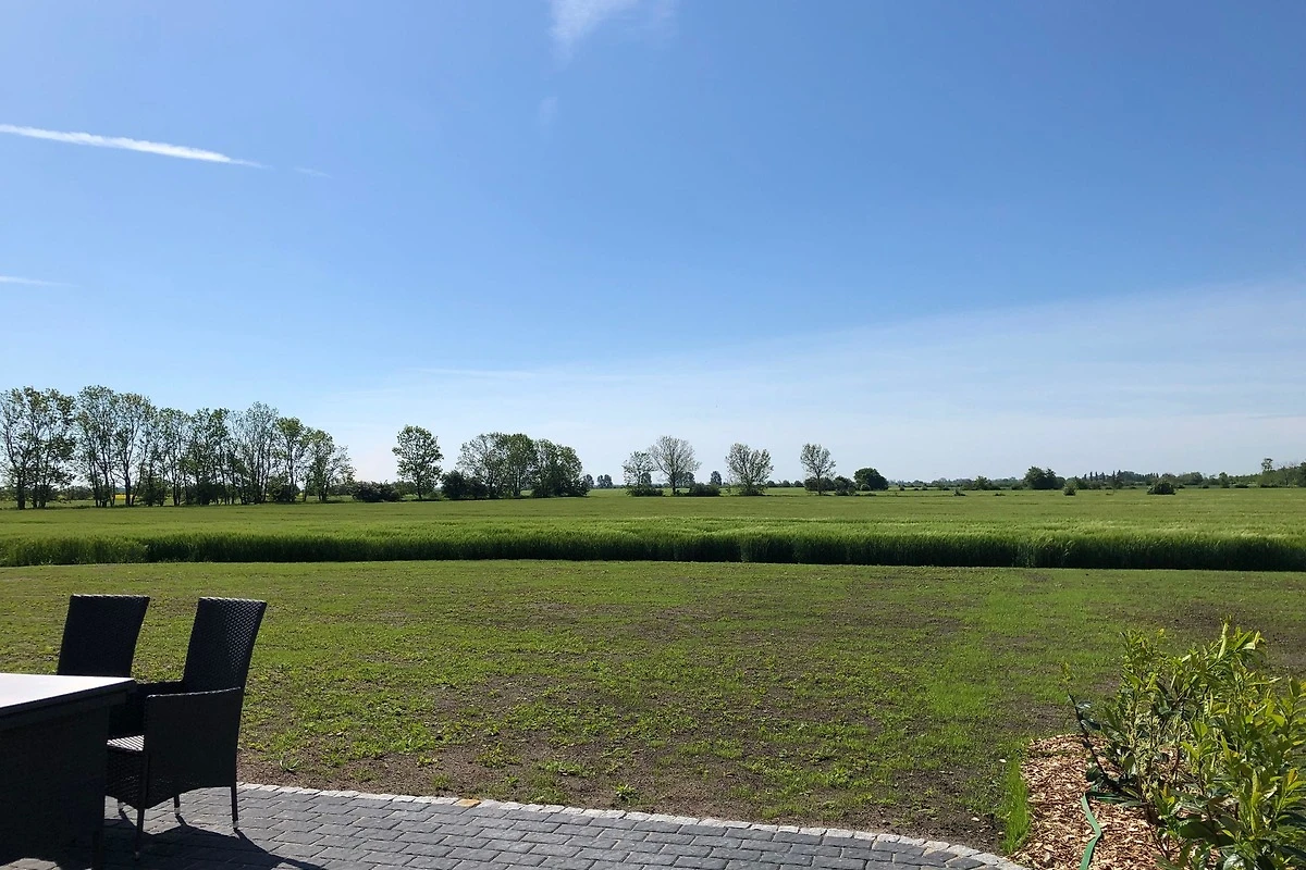 Die grossen Fenster im Wohnbereich geben den Blick frei auf die Wiesen und Felder Fehmarns, welchen Sie sowohl aus der Küche als auch von der gemütlichen Wohnzimmer-Ecke mit Flat-TV geniessen können.