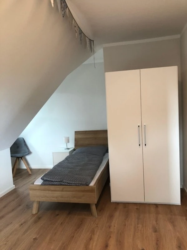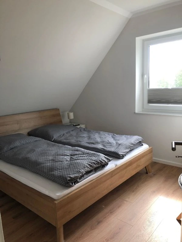 Vom Flur gelangen Sie über die schöne offene Vollholz-Treppe in das Obergeschoss. Dort befinden sich ein Schlafzimmer mit Doppelbett und ein Schlafzimmer mit drei Einzelbetten. Beide Zimmer sind mit einem Kleiderschrank und Nachttischen für jedes Bett ausgestattet. Das grosszügige Bad mit Blick auf den Hof rundet das Angebot ab.