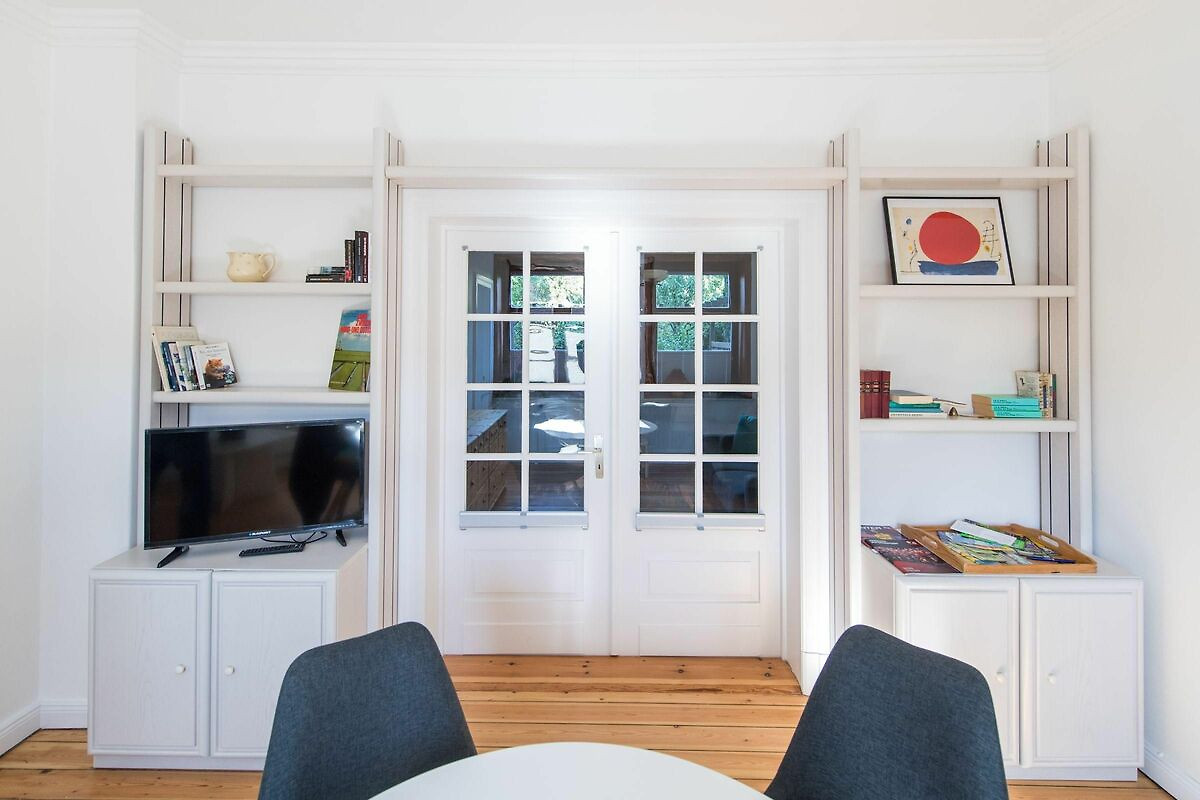 Die große Terrasse mit Garten lädt dazu ein, die frische Luft zu genießen. Bei Bedarf kann auch ein Kinderbett aufgestellt werden, um den Aufenthalt noch komfortabler zu gestalten. Der aufgearbeitete Dielenboden verleiht der Wohnung eine behagliche Wohnatmosphäre.