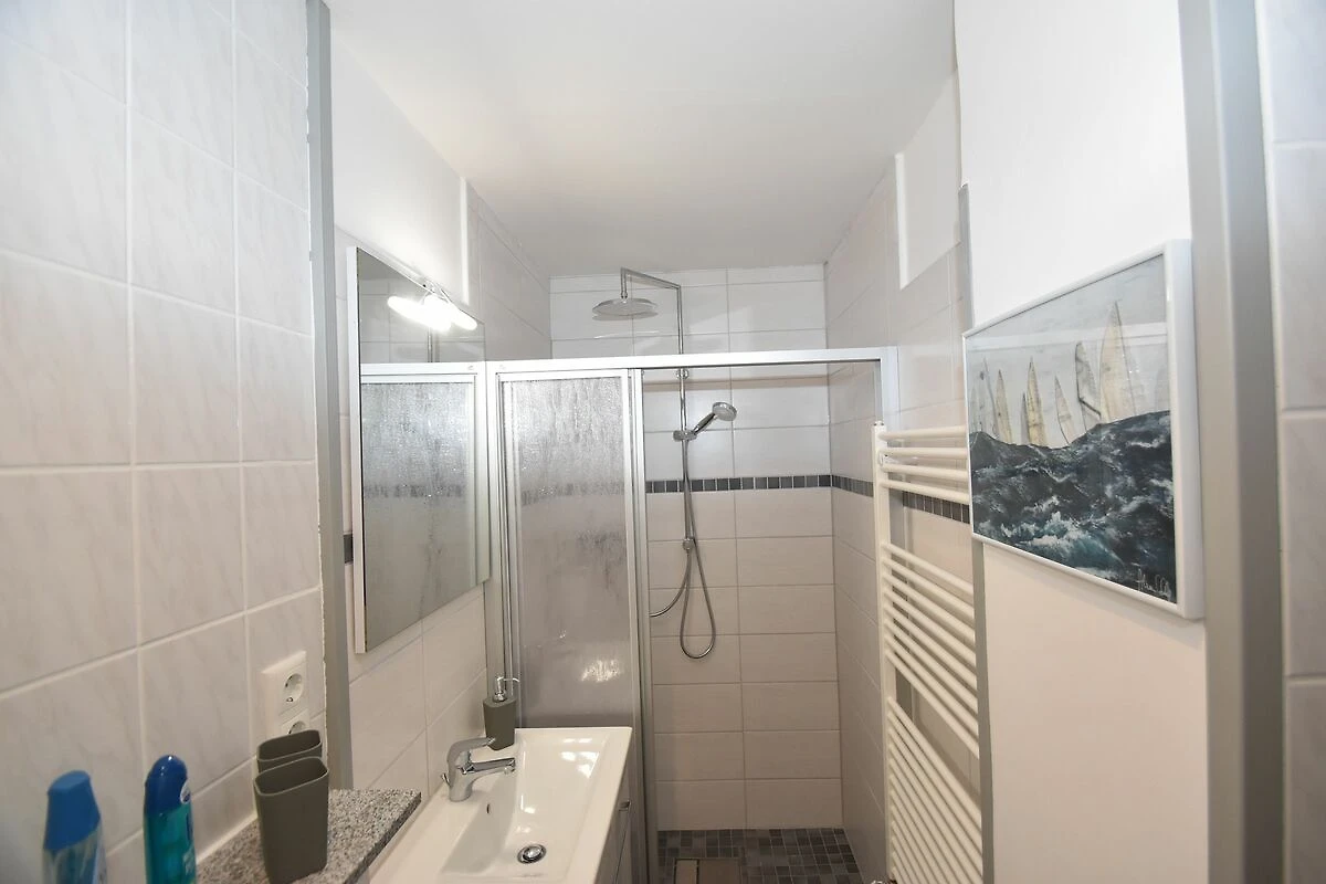 Der moderne Badezimmerbereich ist mit einer bodengleichen Dusche ausgestattet und bietet Ihnen frische Hand- und Badetücher sowie einen Haartrockner. Hier können Sie nach einem aufregenden Tag am Strand entspannen und erfrischen.
