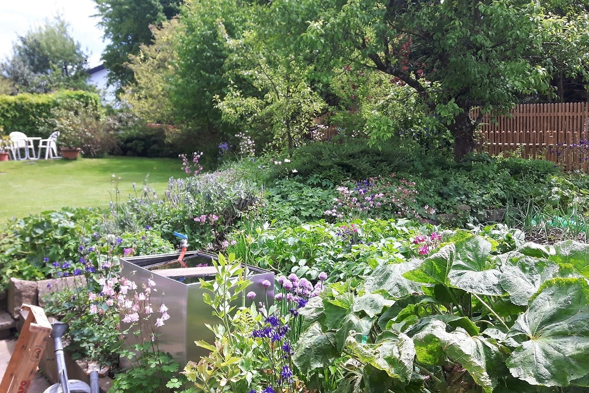 Mitte Mai blüht die Akazie in unserem Hof und verbreitet einen betörenden Duft im Wettstreit mit den anderen Sträuchern. Im Juli gibt es immer noch Bodensee Erdbeeren und Kirschen sowie die ersten frischen Äpfel.
