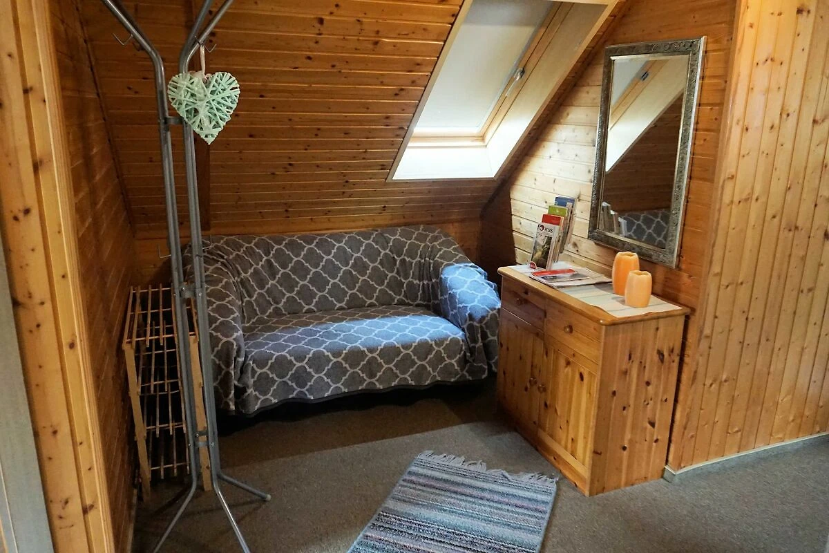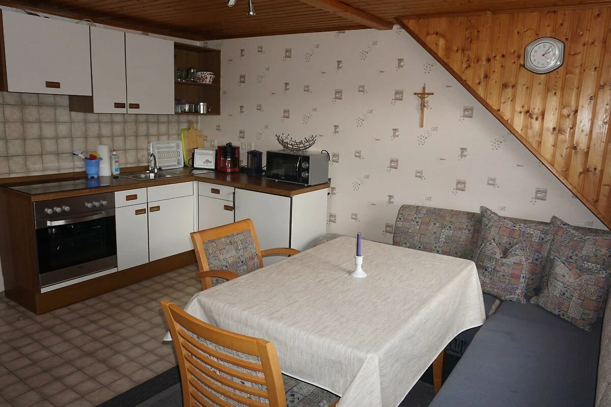 Unsere gemütliche Ferienwohnung (Nichtraucher) befindet sich im Dachgeschoss bzw. im 2. OG und verfügt über zwei Schlafzimmer, einer Wohnküche, einem Badezimmer und einem kleinen Vorraum. Im Schlafzimmer 1 befindet sich ein Doppelbett (2 x 2 m), sowie ein weiteres Zustellbett. Im Schlafzimmer 2 befinden sich zwei Single-Betten (0,9 x 2 m). Beide Schlafzimmer und der Vorraum sind mit Teppichboden ausgestattet. Das Badezimmer verfügt über Dusche/WC und Haartrockner. Die Wohnküche ist ausgestattet mit einem Elektroherd, Kühlschrank, Kaffeemaschine, Wasserkocher, Toaster, Eierkocher, Mikrowelle und einer Fernsehecke mit LED-TV, sowie Blue Ray Player. Zudem stehen Ihnen zur Mitbenutzung eine schöne Terrasse (südwestliche Richtung) mit Raucherbereich und ein Grill zur Verfügung. Dusch-, Hand- und Geschirrtücher werden gestellt. Bettwäsche ist pro Aufenthaltswoche 1x kostenfrei. Jede weitere Garnitur wird pro Bett mit je 3€ berechnet. Auch können Sie das WLAN während Ihres Aufenthalts kostenfrei nutzen.