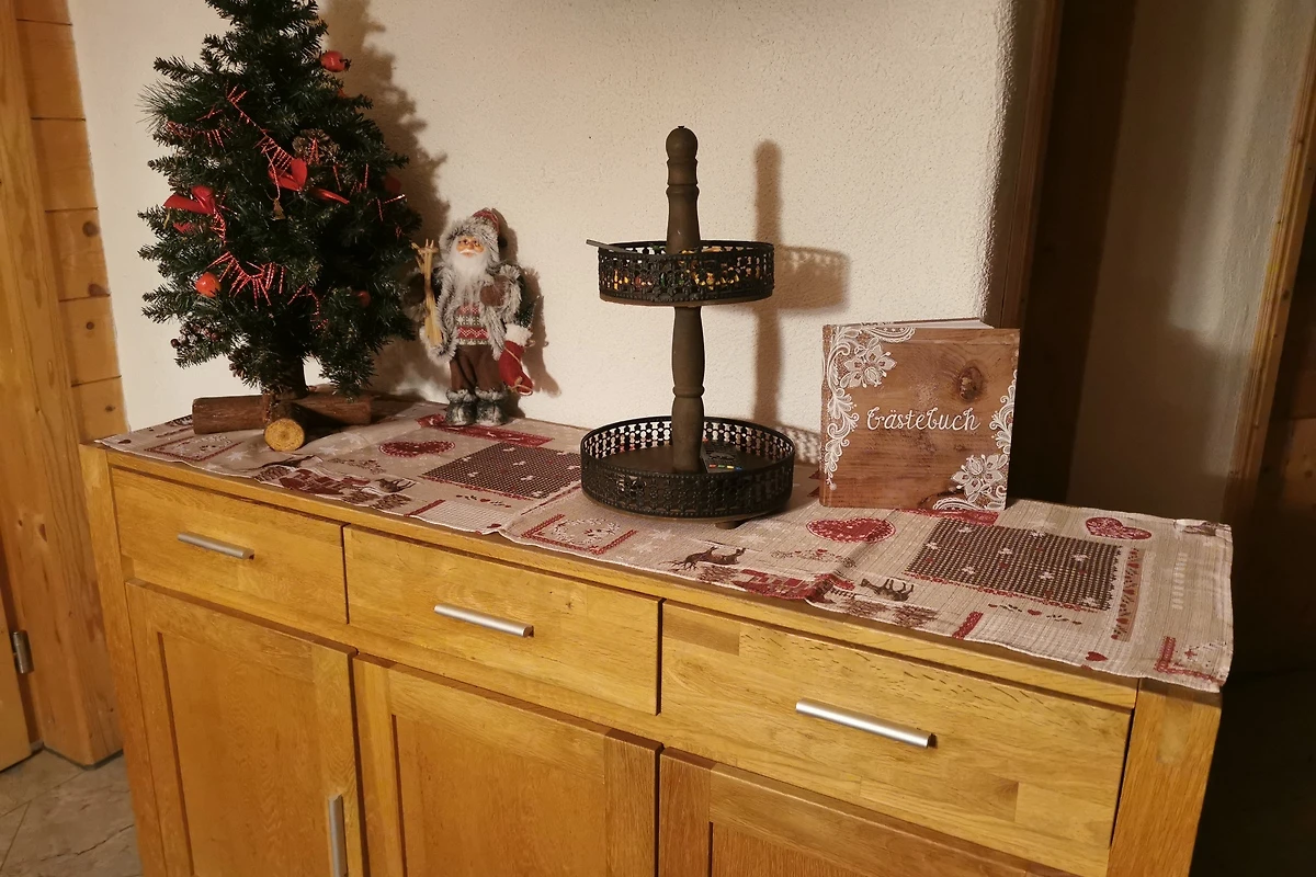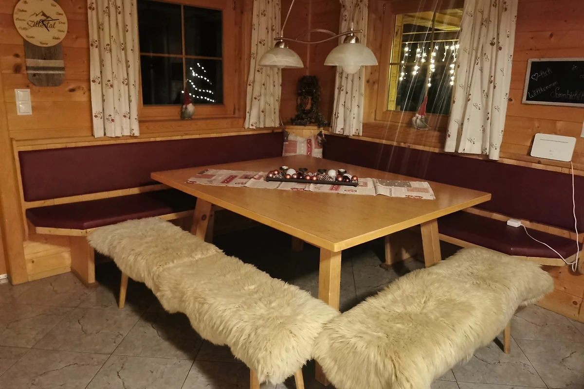 Die großzügige Sitzecke bietet Platz für mindestens 12 Personen. Die Hütte wird mit Öl-Zentralheizung geheizt, für zusätzliche behagliche Wärme sorgen die Fußbodenheizung und ein Holzofen (Brennmaterial vorhanden).