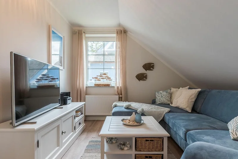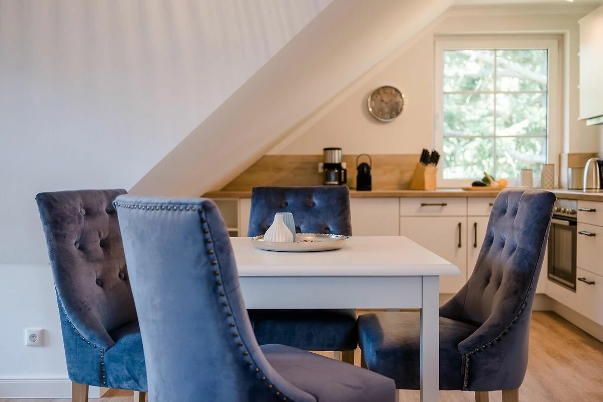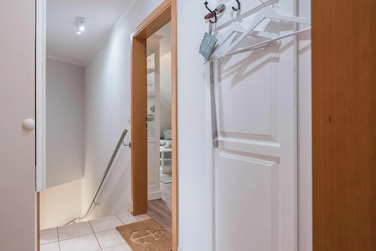 Dieses liebevoll eingerichtete Appartement liegt im Dachgeschoss eines kleinen, romantischen Hauses, das nur aus zwei Wohnungen besteht. Beide Appartments, das hier vorgestellte mit Namen AUSGUCK sowie das im Erdgeschoss befindliche Apartment SEGELMAST können einzeln (jeweils bis 4 Personen) oder auch zusammen als Haus für Familien bis 8 Personen gemietet werden. Auf einem eignen Grundstück gelegen, ist es der ideale Ort für ruhige und entspannte Stunden am Meer.