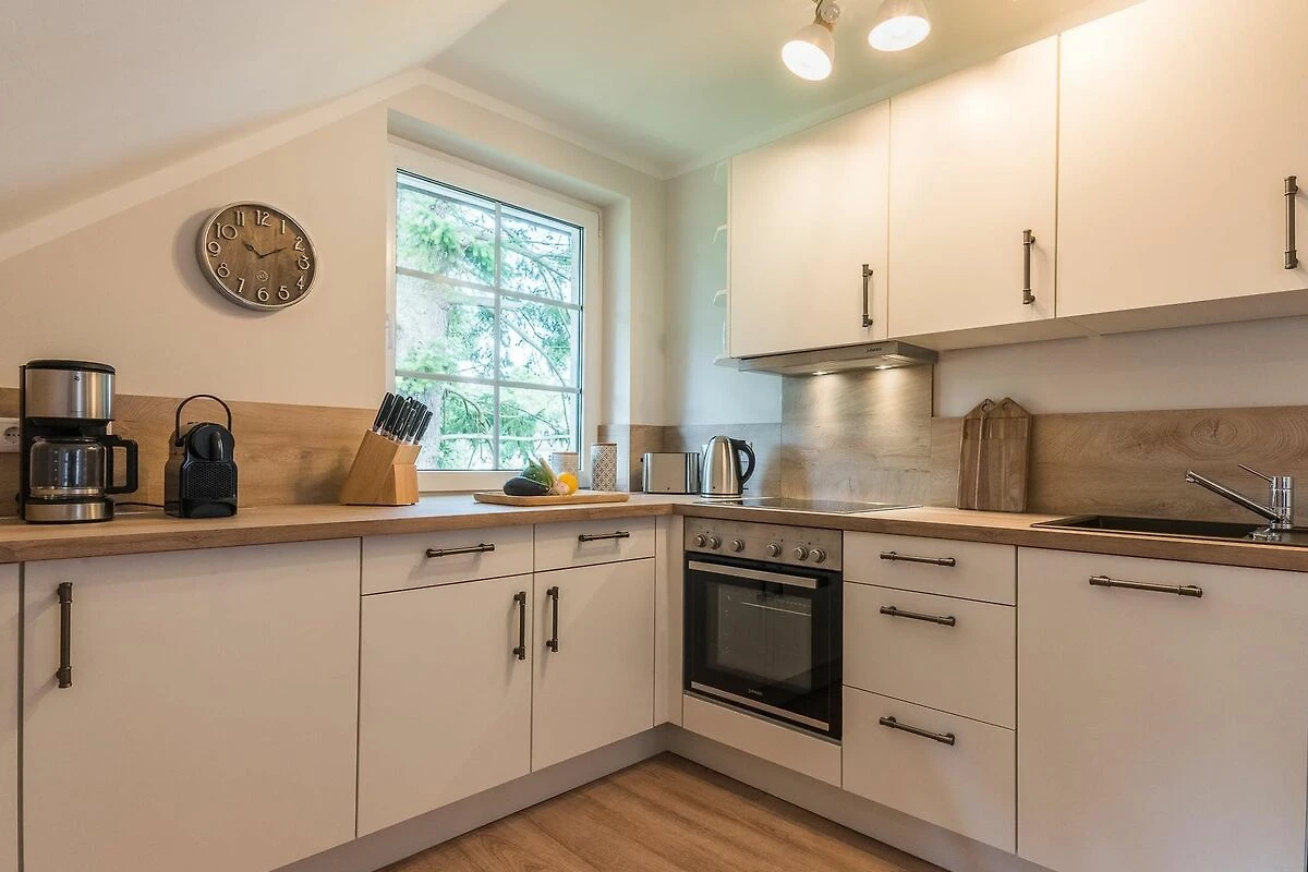 Der trotz des Dachgeschosses helle Wohnbereich diese Appartments umfasst eine urgemütliche Relaxcouch zum Entspannen sowie mit einer Schlaffunktion für zwei Personen. Der separate Essbereich grenzt an die offene Küche, die für das gemütliche Frühstück am Morgen voll ausgestattet ist.