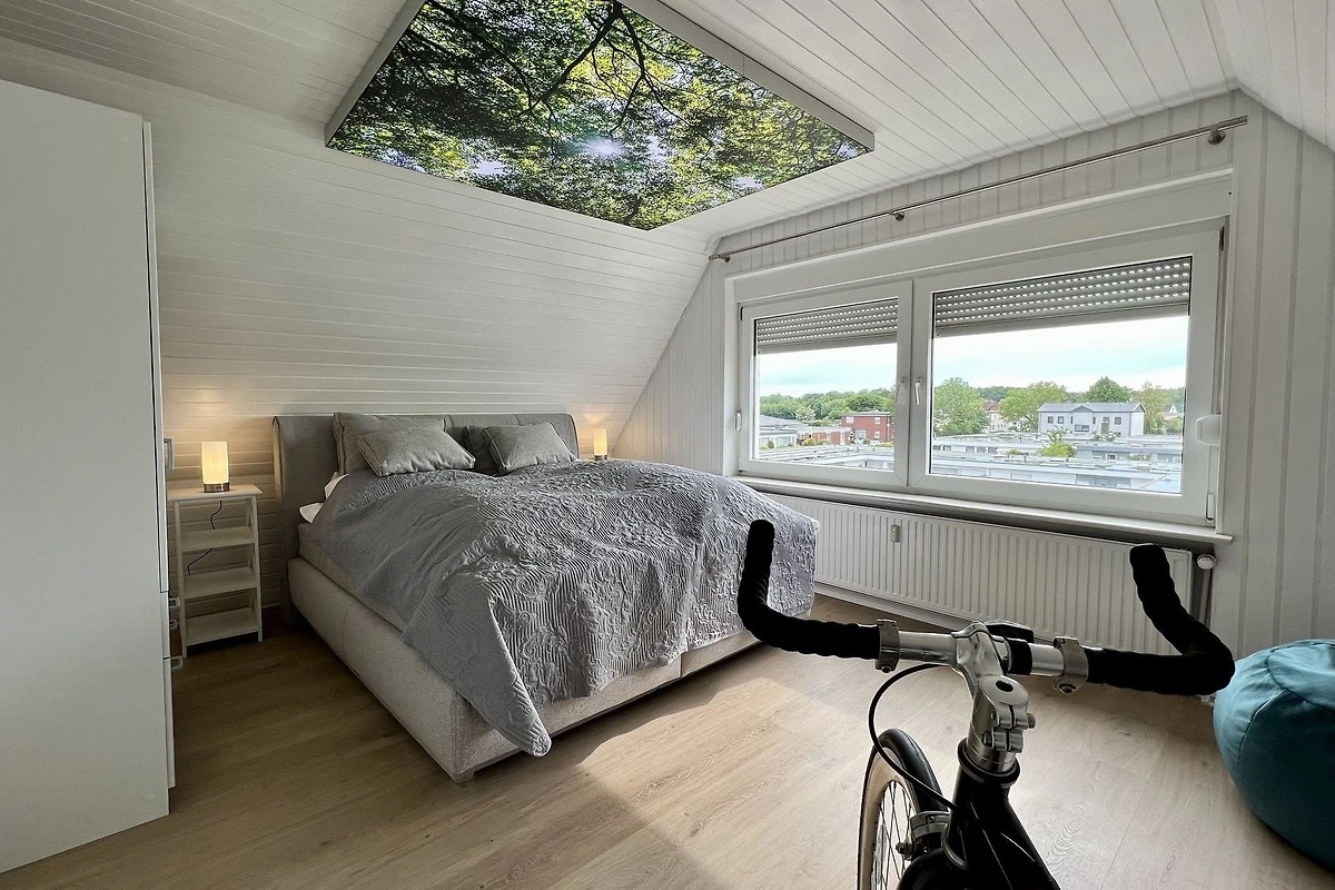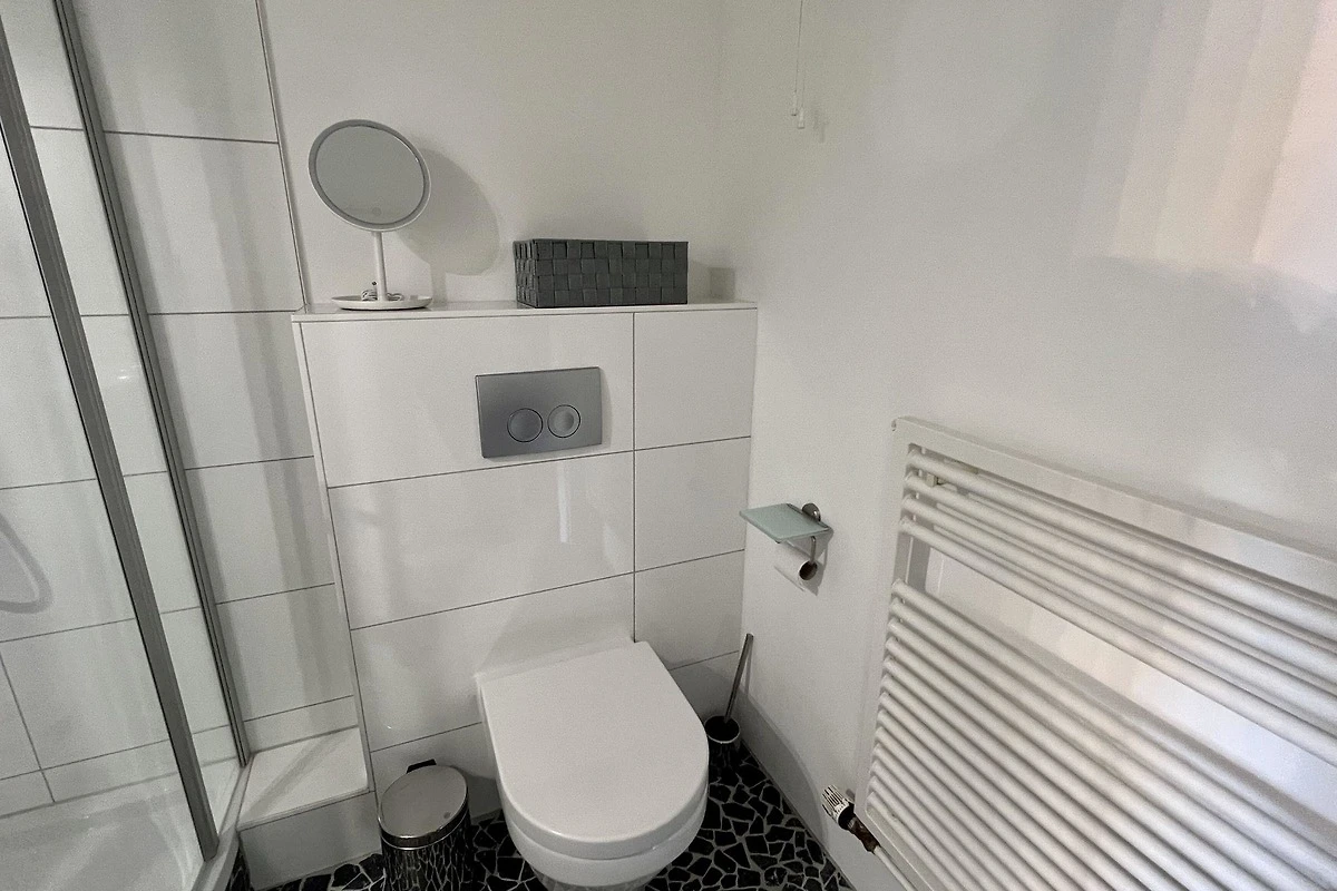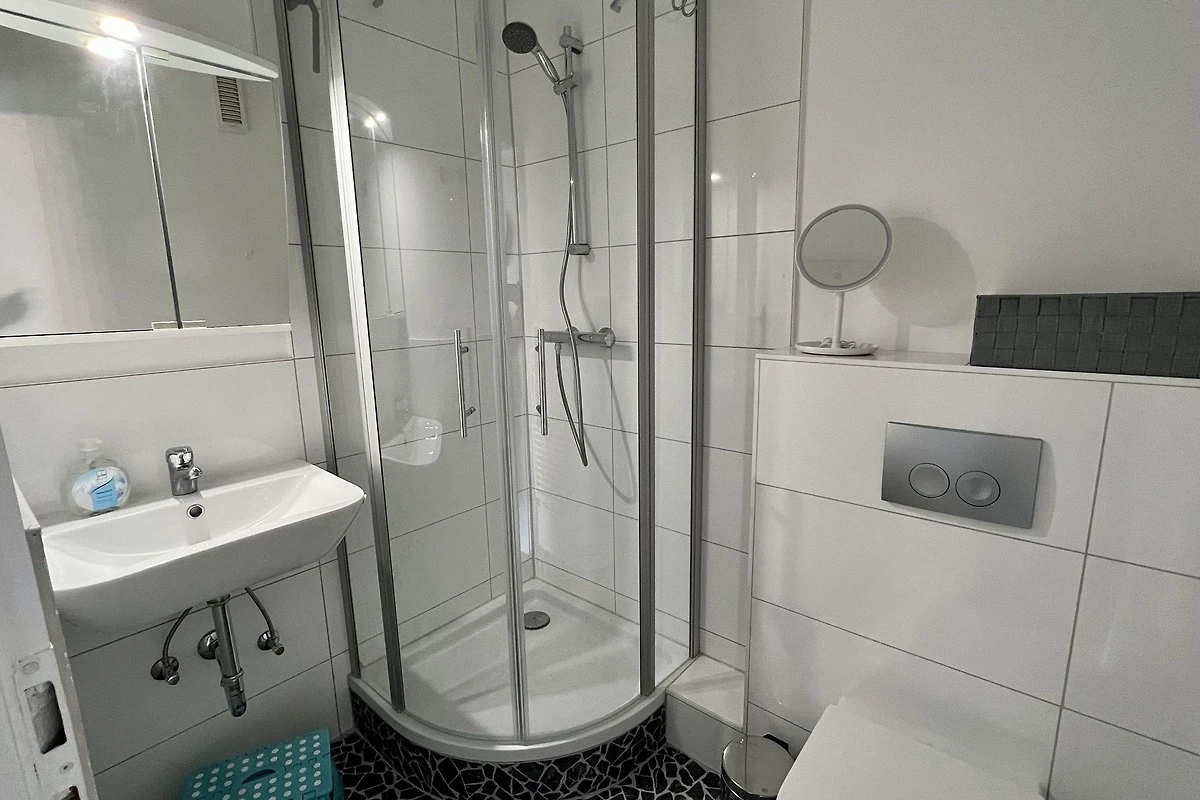 Tageslicht helles Duschbad, im linken Bereich befindet sich ein weiteres Schlafzimmer mit Doppelbett, ein WC und ein Abstellraum, sowie praktische Einbauschränke im Zimmer und auf dem Flur.