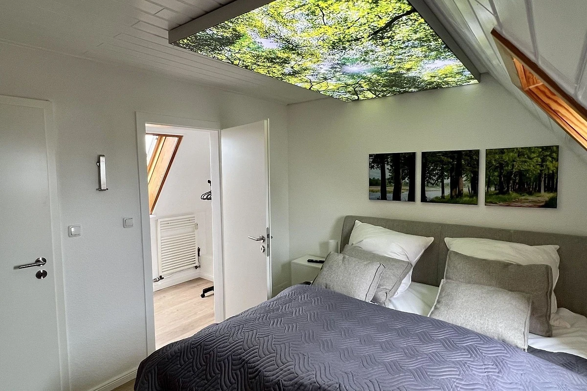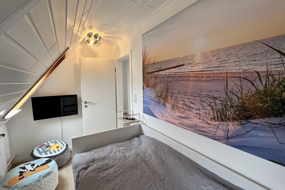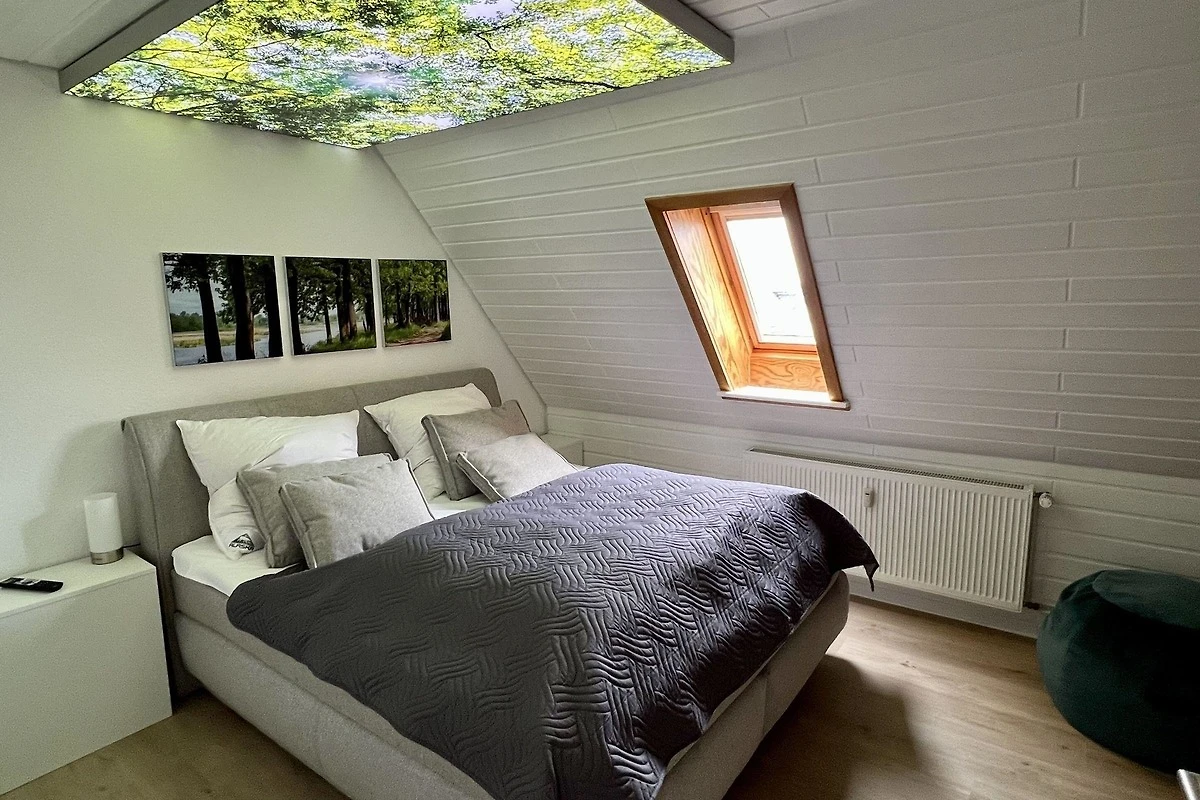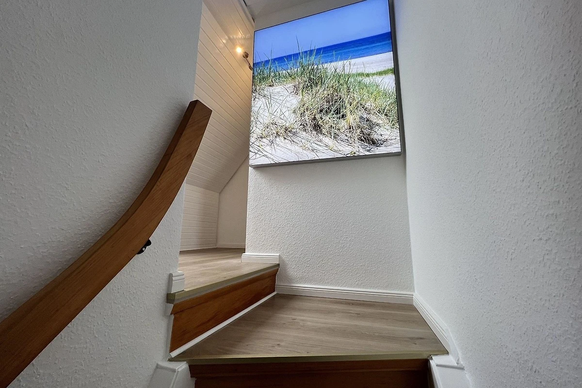 Über eine Holztreppe gelangen Sie ins 2. OG, dort befinden sich drei Schlafräume: zwei mit jeweils einem Doppelbett und ein Schlafraum mit zwei Einzelbetten.