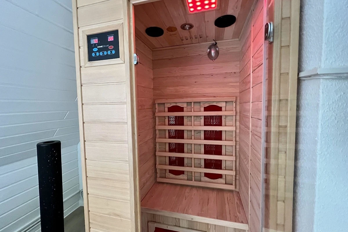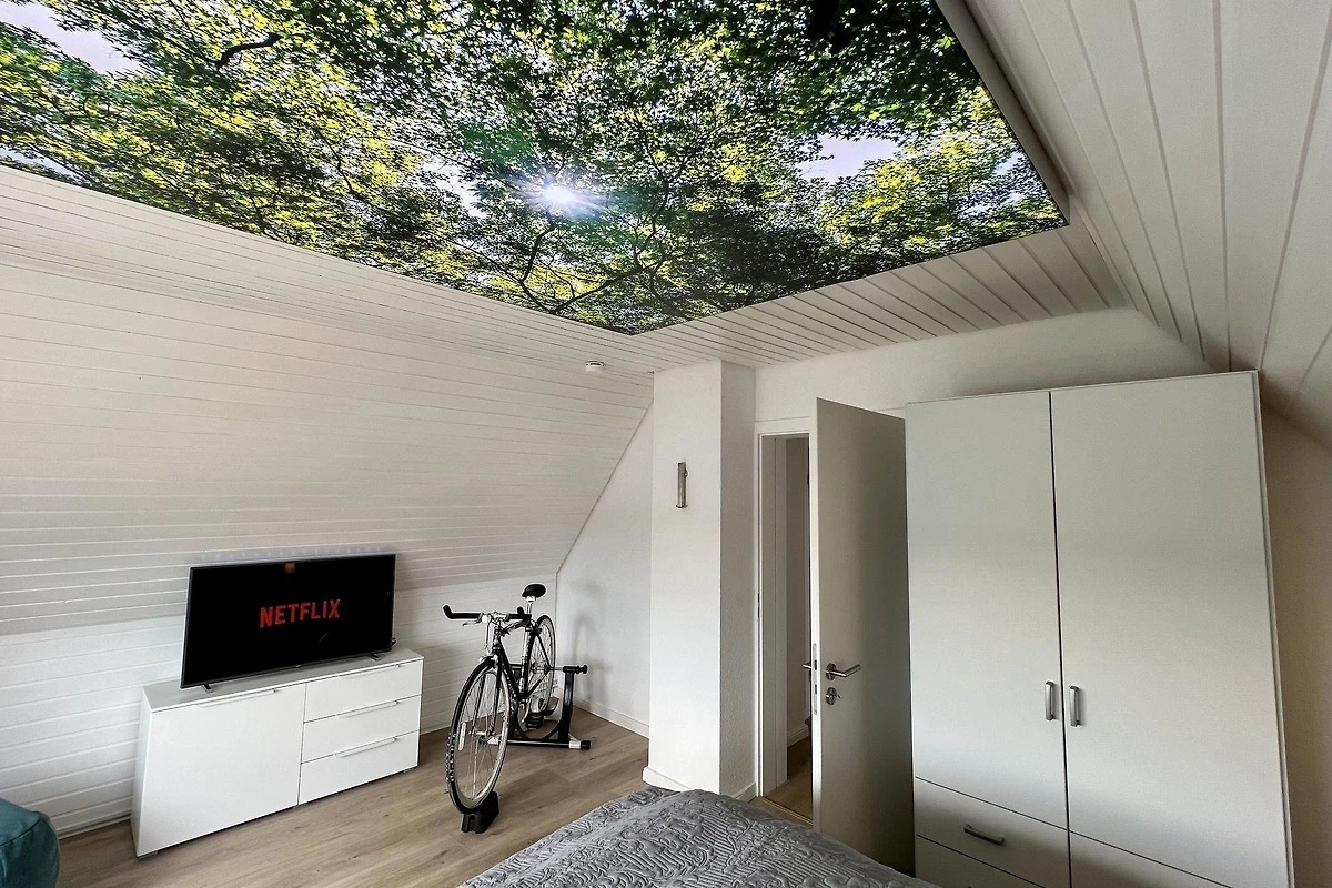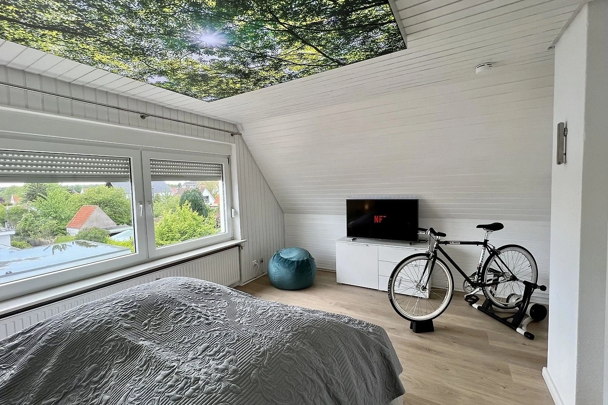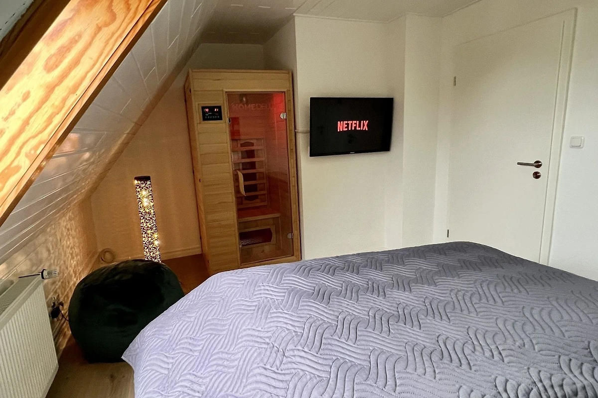 Über eine Holztreppe gelangen Sie ins 2. OG, dort befinden sich drei Schlafräume: zwei mit jeweils einem Doppelbett und ein Schlafraum mit zwei Einzelbetten.