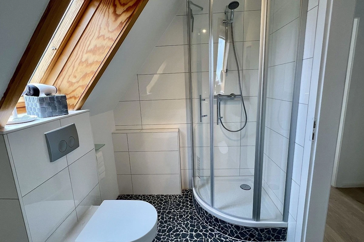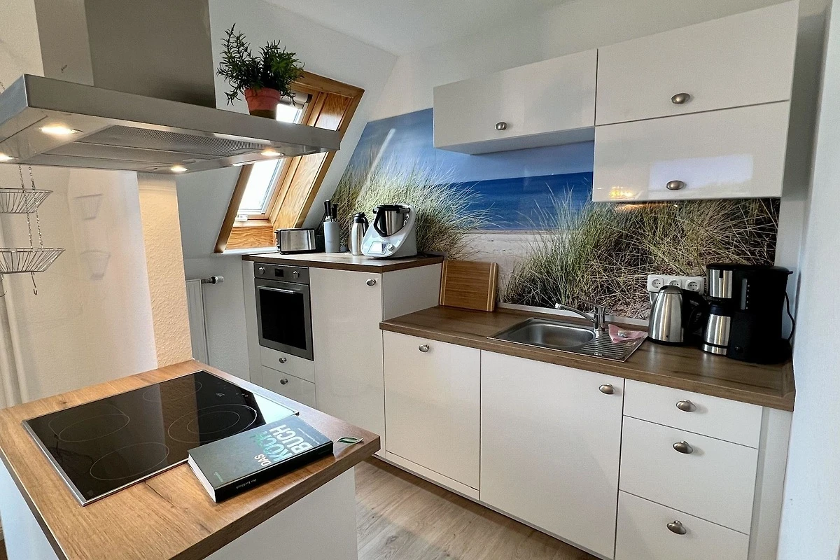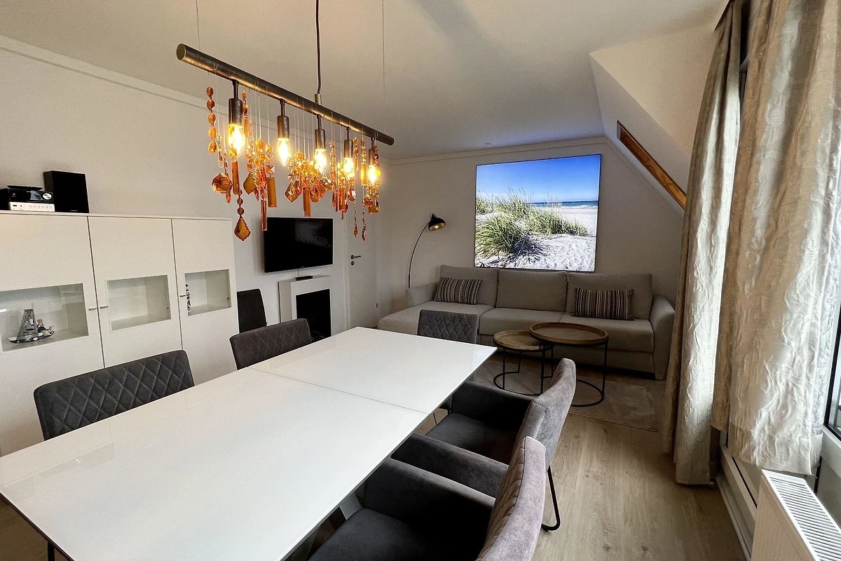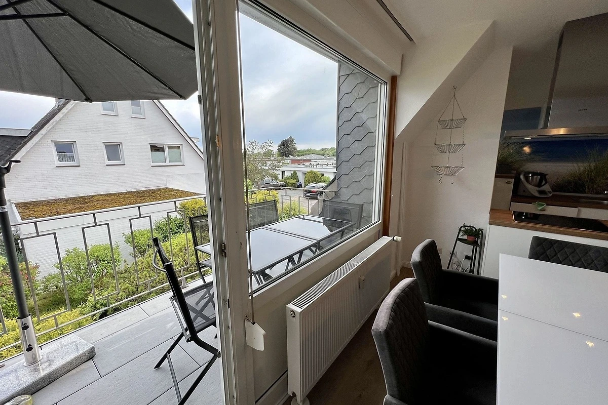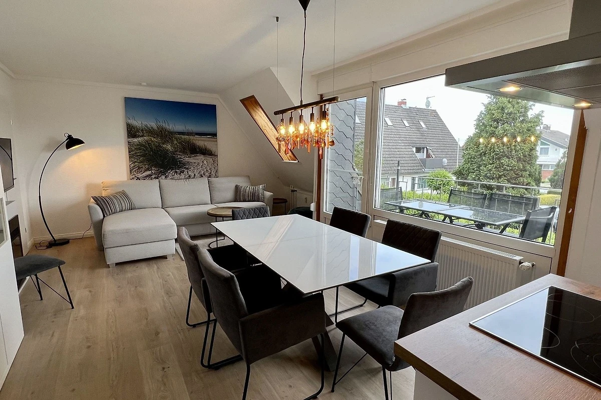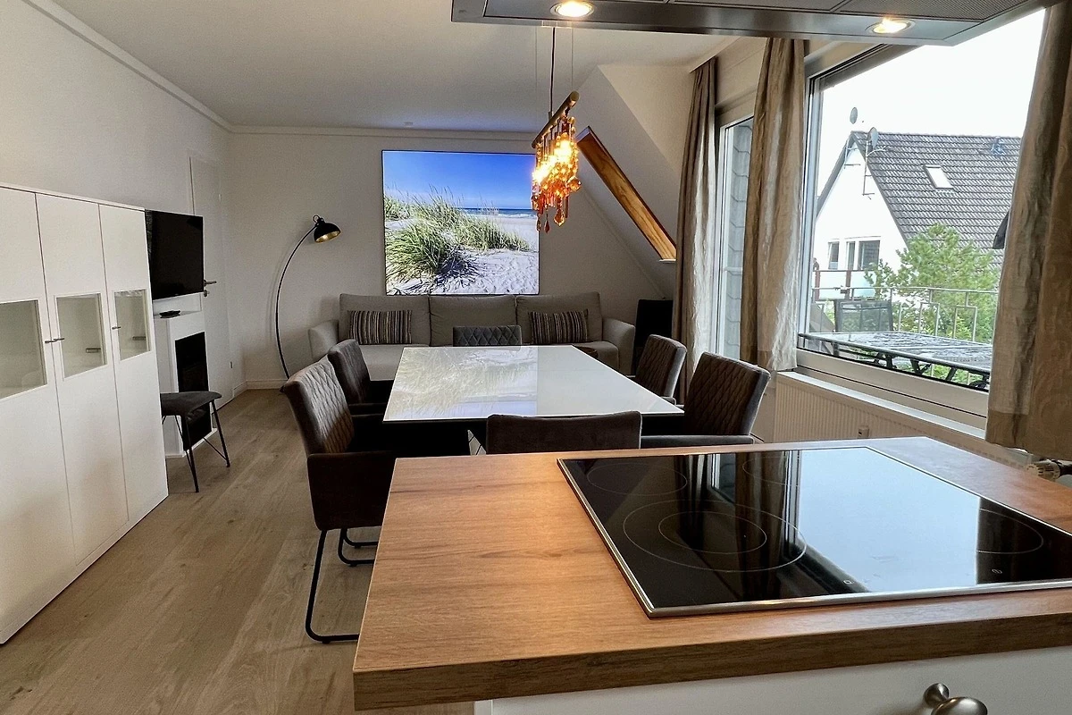 Ankommen und Wohlfühlen... geschmackvoll und perfekt bis ins kleinste Detail empfängt Sie im 1. OG das heimelige Wohnzimmer mit direktem Zugang zum grossen Süd-Balkon und wunderbarem Blick über Dahme bis hin zum Leuchtturm Dahmeshöved, eine moderne voll ausgestattete Küche, ein grosszügiger Essplatz für 8 Personen, ein modernes WC mit Dusche und ein Abstellraum.