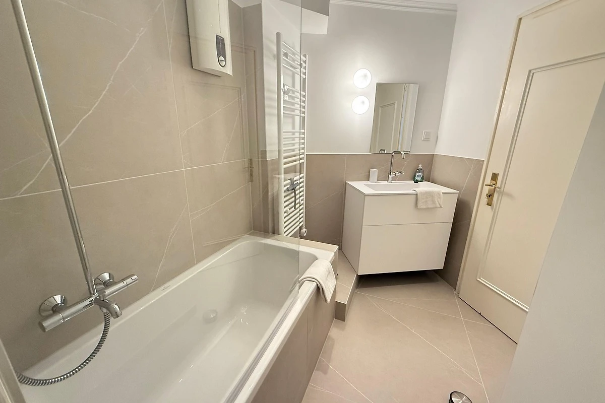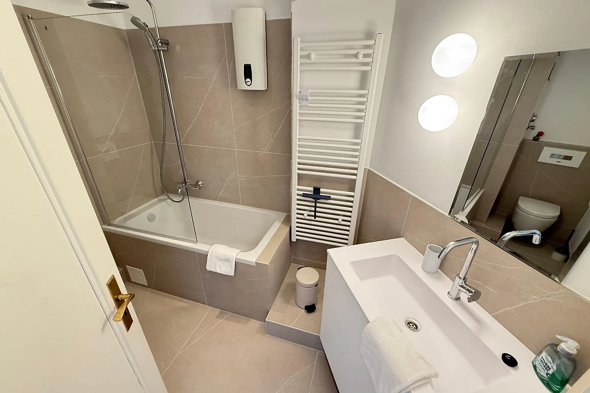 Das moderne Badezimmer ist mit einer Dusche und einem WC ausgestattet und bietet den Komfort, den Sie für einen entspannten Aufenthalt benötigen.