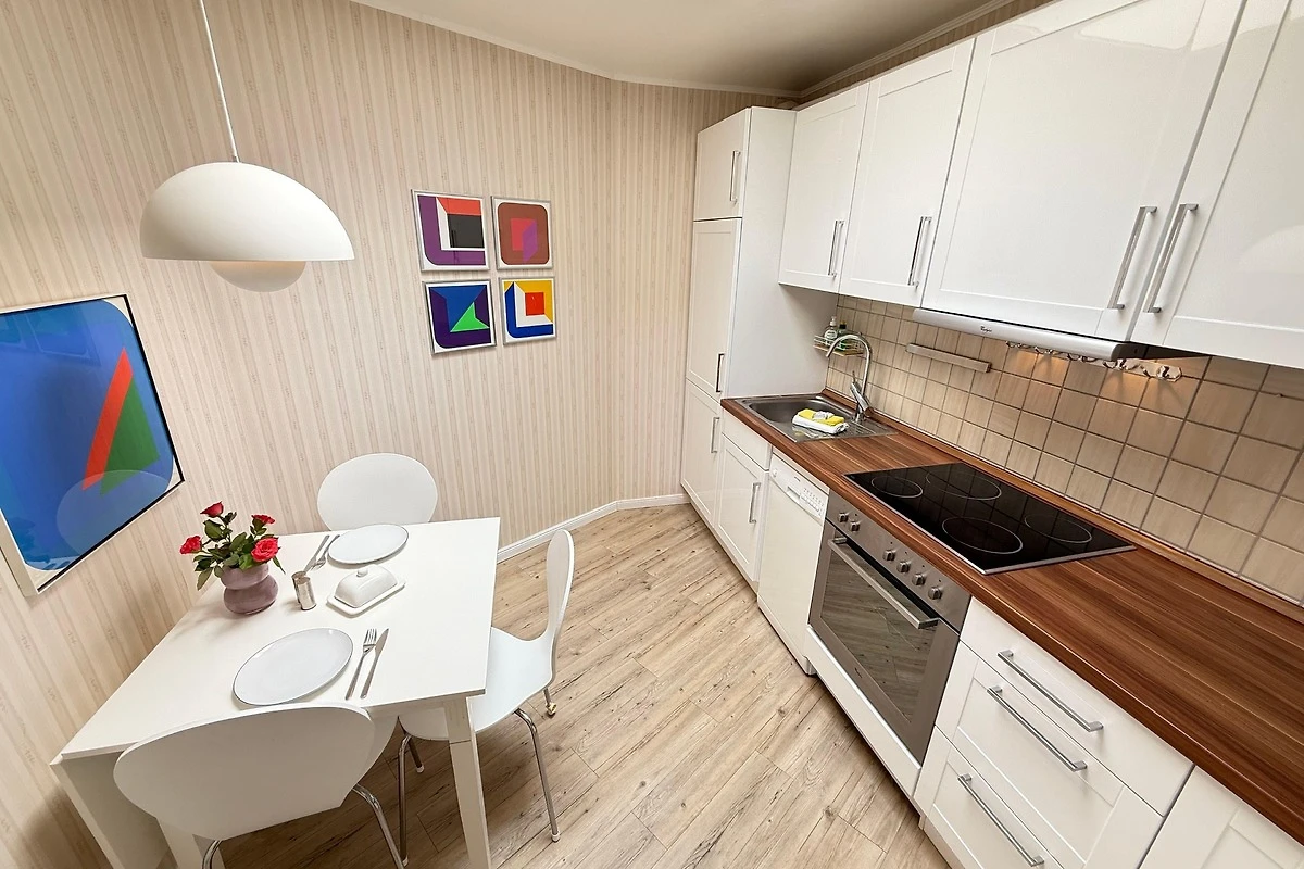 Das helle Schlafzimmer ist mit einem komfortablen Doppelbett (180x200 cm, getrennte Matratzen) ausgestattet und sorgt für erholsame Nächte. Im separaten Wohnzimmer erwartet Sie ein gemütliches Schlafsofa, das weiteren Gästen Platz bietet. Eine einladende Essecke und eine voll ausgestattete Küche machen diese Wohnung zu einem gemütlichen Rückzugsort, wo Sie gemeinsam kochen und speisen können.