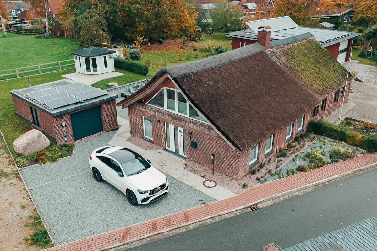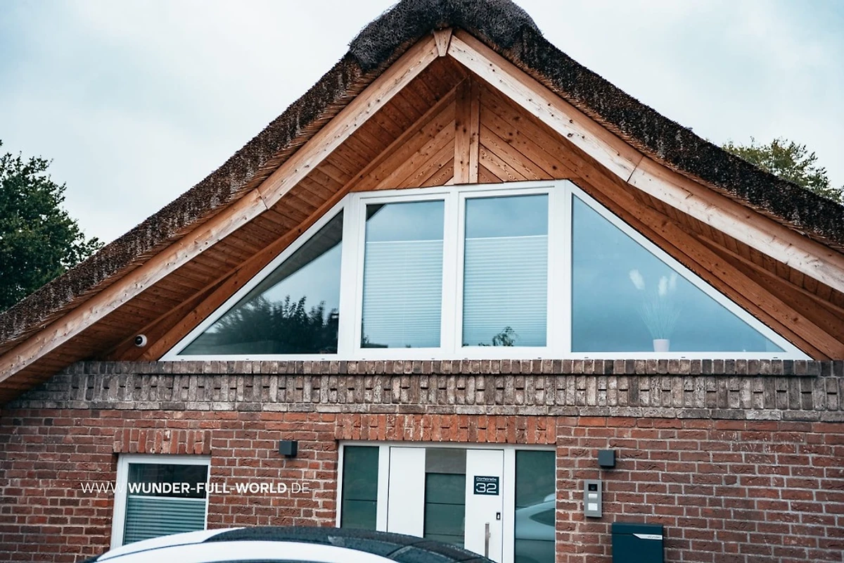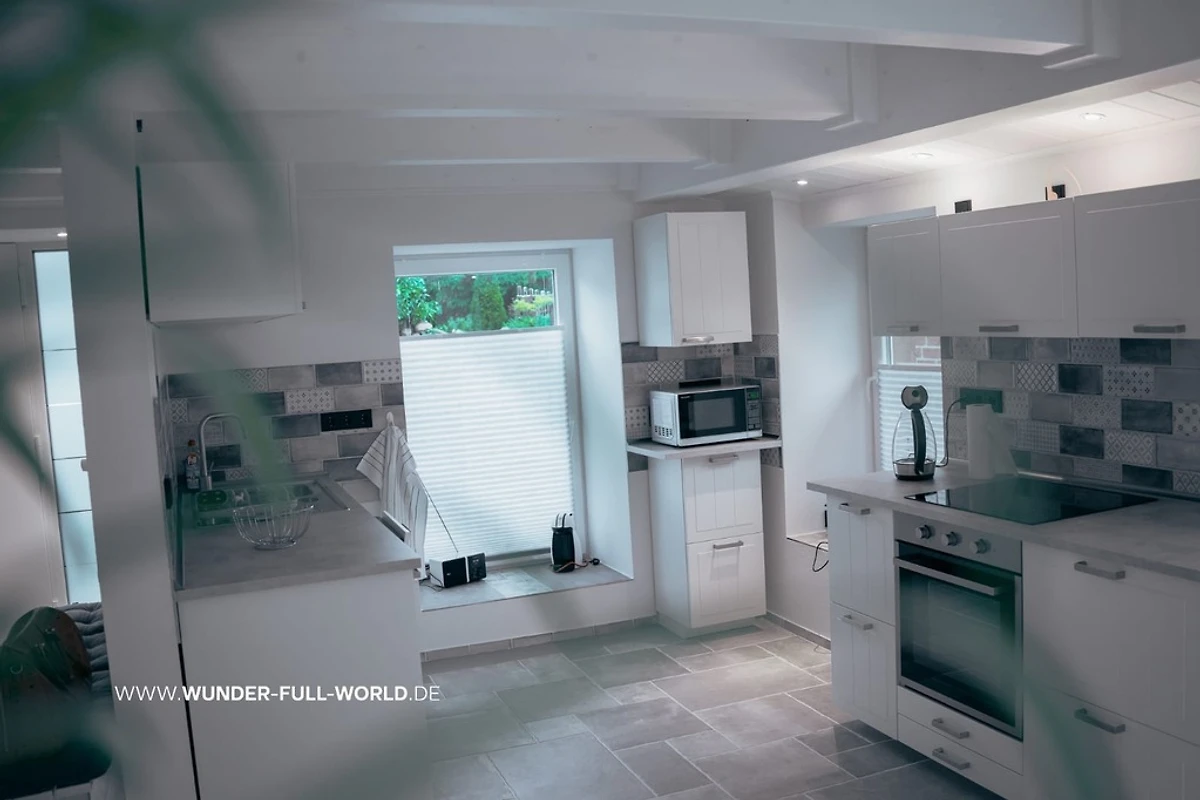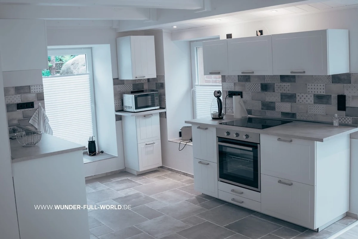 Das idyllische Reetdachhaus vereint traditionellen Charme mit modernem Komfort und bietet Ihnen lückenloses W-LAN sowie ein umfassendes Datennetzwerk. Es erwartet Sie ein gemütliches Schlafzimmer, eine stilvolle Galerie mit zwei Einzelbetten oder einer komfortablen Schlafcouch, ein eleganter Essbereich und eine brandneue, offene Küche. Das moderne Bad ist mit einer ebenerdigen Dusche ausgestattet, während eine separate Gästetoilette zusätzlichen Komfort bietet.