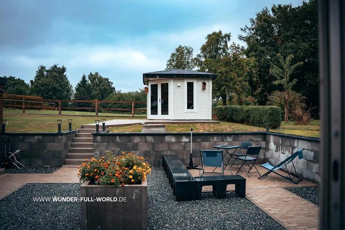 Im Außenbereich lädt ein wunderschöner Pavillon zum Verweilen ein. Zwei Stellplätze für Autos stehen Ihnen ebenso zur Verfügung, und die großzügige Terrasse bietet viel Raum, um die frische Luft zu genießen.