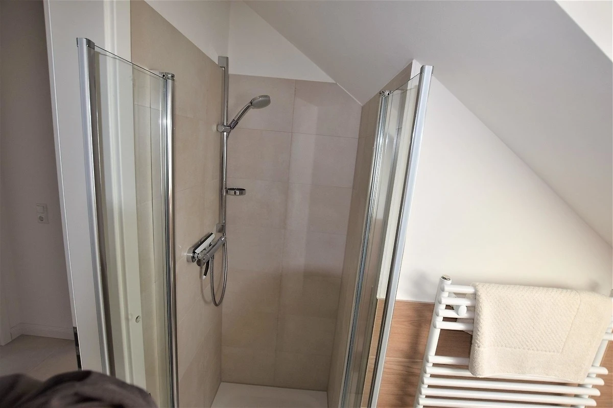 Die Ferienwohnung „Wellenreiter“ erstreckt sich über 100 m² auf zwei Ebenen (1. OG und DG) und bietet Platz für 2 bis 6 Personen. Sie überzeugt durch hochwertige Innenausstattung mit Parkettböden und Fliesen. Das Wohnzimmer verfügt über einen Essbereich und eine integrierte Einbauküche, ausgestattet mit Geschirrspüler, Induktions-Ceranfeld, Dunstabzugshaube, Backofen, Mikrowelle, Kühlschrank mit Gefrierfach sowie diversen Kleingeräten. Insgesamt stehen drei Schlafzimmer mit Doppelbetten, Schränken und einem zusätzlichen Schreibtisch im DG zur Verfügung. Zwei Duschbäder und moderne Annehmlichkeiten wie WLAN, TV mit DVD und Fussbodenheizung sind ebenfalls vorhanden. Ein grosszügiger, möblierter Balkon rundet das Angebot ab. Im Gebäude befinden sich zudem eine Waschmaschine und ein Bügeleisen, die gemeinschaftlich genutzt werden können. Hunde sind erlaubt, und ein PKW-Stellplatz ist direkt vor dem Haus verfügbar.