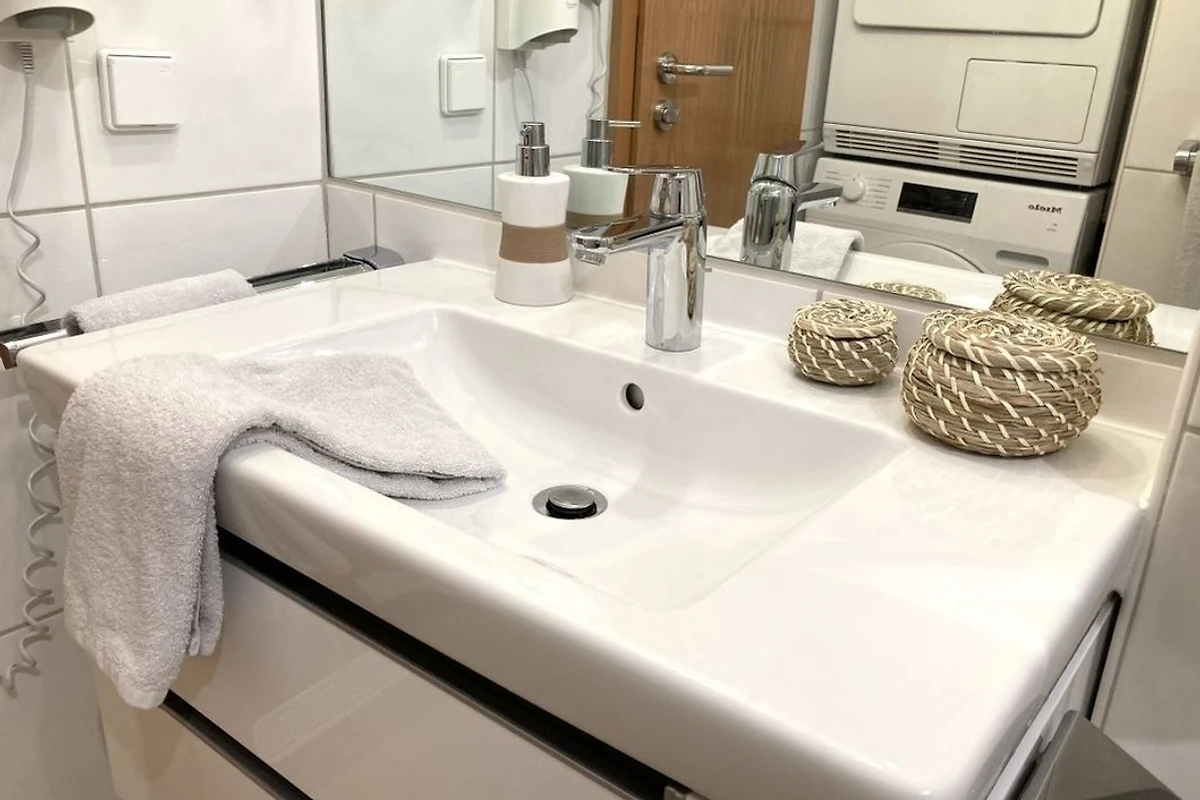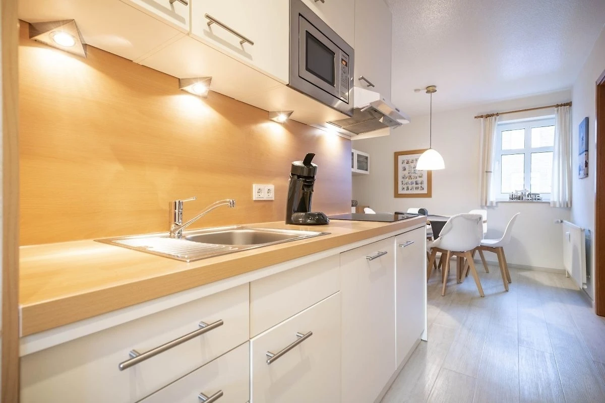 Die Wohnung ist vom DTV mit 4 Sternen ausgezeichnet und entsprechend komfortabel eingerichtet. Im Haus befindet sich ein frisch renoviertes Schwimmbad- und Saunabereich. Die Küche ist komplett und neu ausgestattet. Sie finden hier alles: Spülmaschine, Mikrowelle, Backofen, Wasserkocher, Eierkocher, Toaster, Waffeleisen, 3-Mix, Senseo- oder Filterkaffeemaschine zur Auswahl und mehr! Im Essbereich befindet sich ein runder Esstisch an dem 6 Personen bequem Platz finden. Im Wohn-Schlafzimmer ist ein Doppelbett (160x200) optisch durch einen Schrank vom einladenden Sofa mit Récamiere getrennt. Das Smart-TV ist zum Bett hin drehbar. In einem Schlafzimmer befindet sich ein Doppelbett (160x200) und in dem 2. Schlafzimmer ein Etagenbett, das eher für Kinder ausgelegt ist (180x90). Das Duschbad enthält ausreichend Handtuchstangen, Haken, Ablagen, Föhn und 2 grossen Schubladen, sowie eine Dusche mit Glas-Duschabtrennung. Ihnen steht in der Wohnung eine Waschmaschine, ein Wäschetrockner und ein Bügeleisen zur Verfügung. Sie finden die Ferienwohnung für Sie komplett hergerichtet vor. Bettwäsche, Handtücher, Bademäntel und Küchentücher sind im Preis enthalten und werden regelmässig ausgetauscht. Unsere Hausdame steht Ihnen für Fragen und Wünsche zur Verfügung.