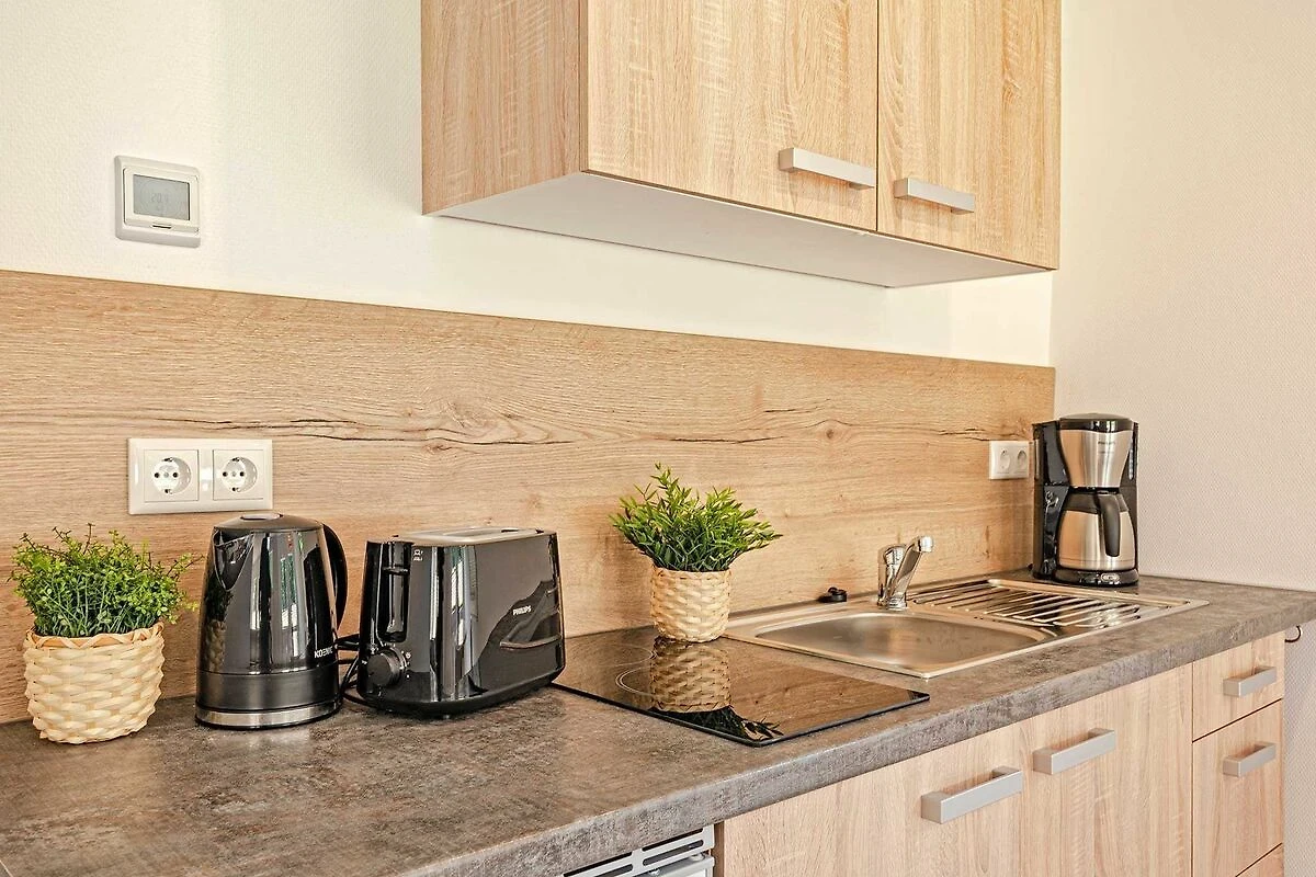 - 1 Wohnraum mit Küchenzeile (Kühlschrank, Spüle, 2er-Ceranfeld, Kaffeemaschine, Toaster, Wasserkocher) und Essplatz, Fernseher, 1 Couch, Sideboard