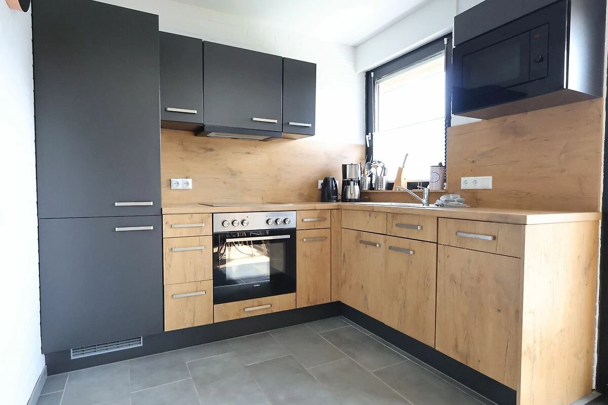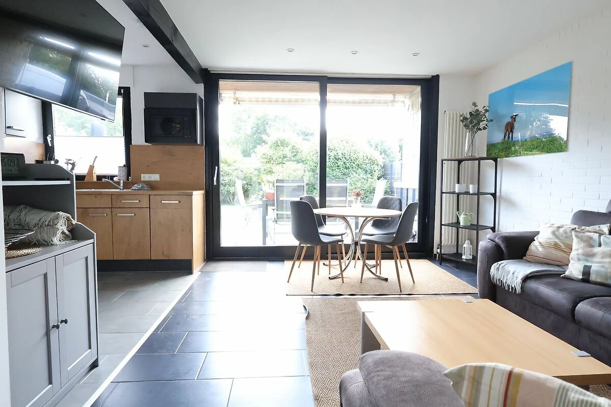 Neben einer gut eingerichteten und neuen Küche mit Geschirrspüler, Kühlschrank mit Eisfach, Ofen, Mikrowelle und Ceranfeld, erwarten Sie zusätzlich ein grosser Flachbildfernseher im Wohnbereich, Internetzugang, ein grosses Sofa, sowie ein Parkplatz. Eine Zentralheizung erwärmt das gesamte, durchgefliesste Haus. Zum Garten hin gelegen ist eine ca. 30 qm² grosse Terrasse vom Wohnzimmer aus begehbar. Dort stehen neben Sitz- und Liegemöbeln auch ein Grill sowie ein Sonnenschirm im windgeschützten Aussenbereich und eine ausfahrbare Markise. Der Garten ist komplett eingezäunt und absolut hundefreundlich.