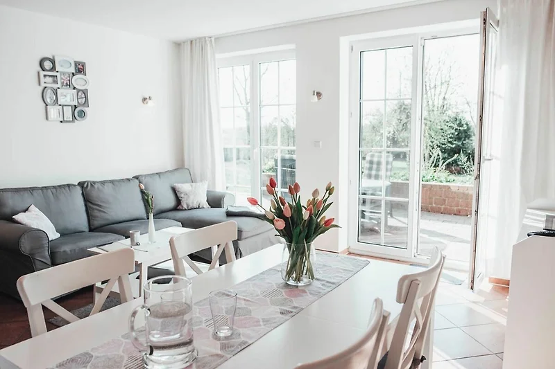 Die 68m² grosse Lilienwohnung befindet sich im Erdgeschoss und ist barrierefrei. Über die Terrasse kann man direkt in den grossen Bauerngarten gelangen. Die Wohnung hat einen grossen Wohnbereich mit voll ausgestatteter Küche. Es gibt zwei Schlafzimmer mit jeweils zwei Betten. Bettwäsche, Handtücher und Endreinigung sind im Preis enthalten. WLAN steht kostenfrei zur Verfügung. Alle Wohnungen sind Nichtraucherwohnungen. Gerne stellen wir bei Bedarf Babybett und Hochstuhl bereit. Haustiere sind auf Anfrage möglich. Im Februar 2022 haben wir die Wohnung renoviert und mit neuen Möbeln ausgestattet.