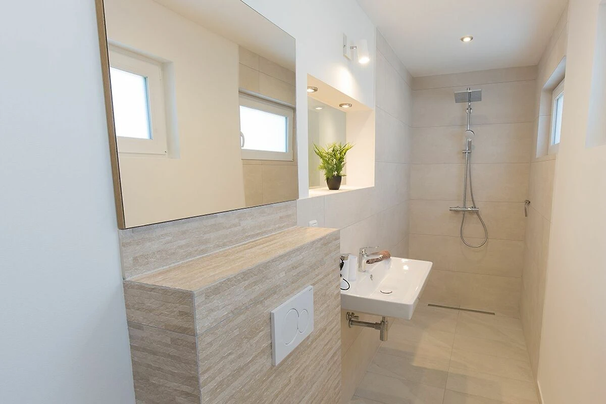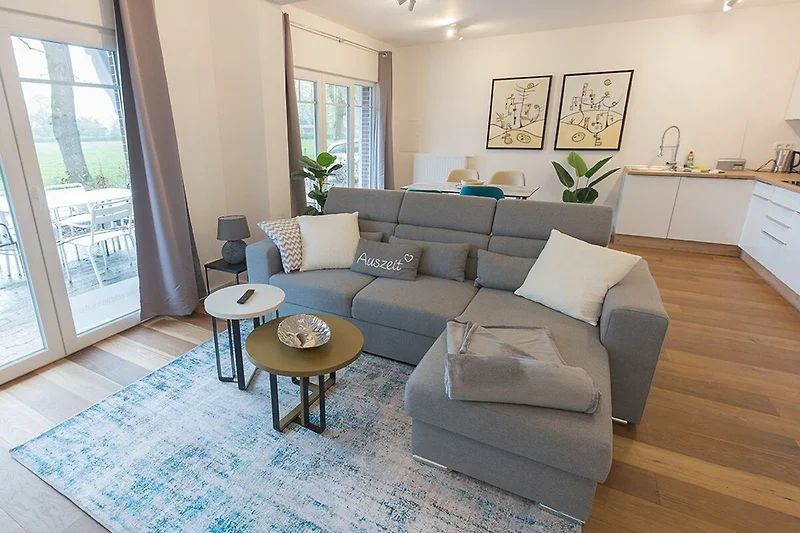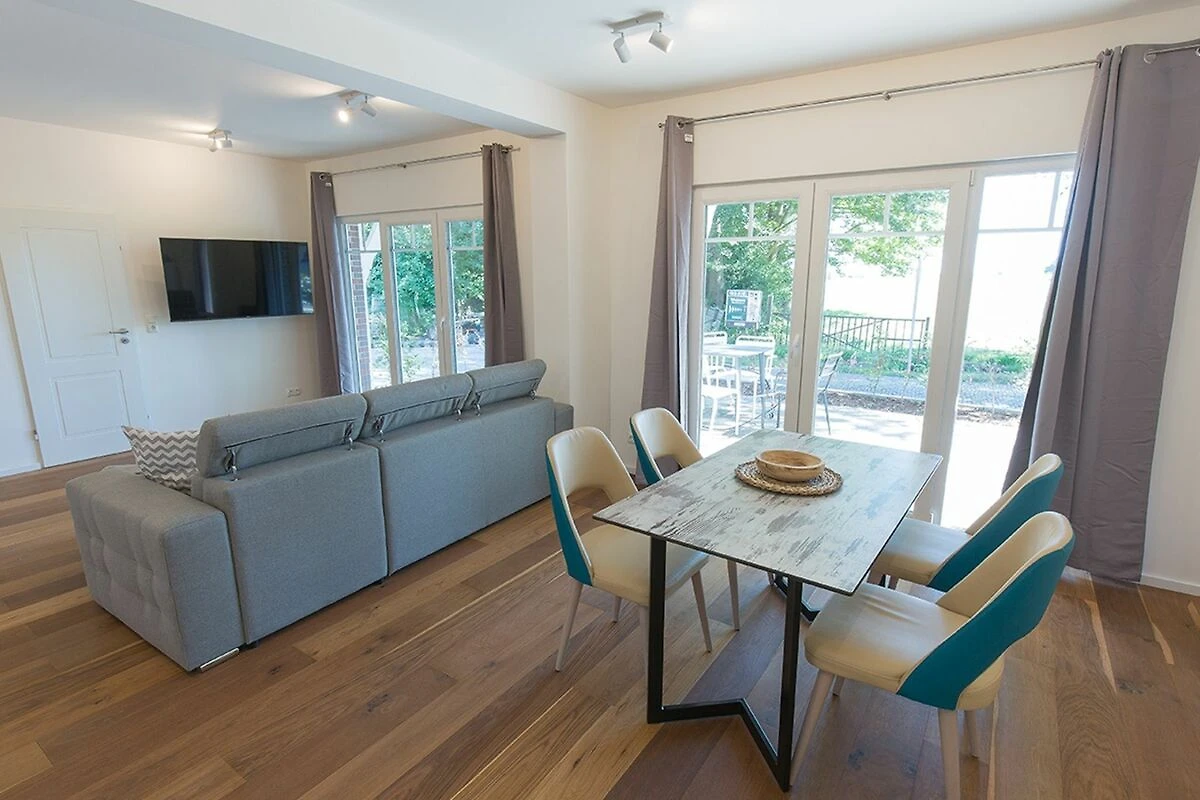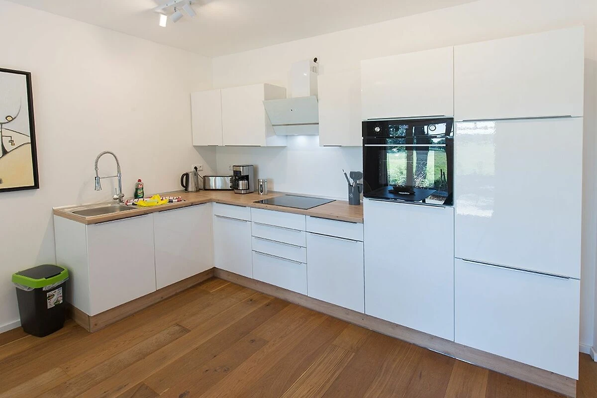 Unsere Wohnung Fresenhuus 4 ist Teil der Ferienwohnanlage achtteihn in der Oldeoogstrasse. Ihr PKW-Stellplatz liegt unmittelbar vor der Anlage. Sie betreten ihre Ferienwohnung auf der Rückseite von der grossen Südterrasse aus. Im gesamten Objekt wurde Echtholz-Eichenparkett verlegt. Es empfängt Sie ein langer heller Flur mit Garderobe. Vom Flur aus erreichen Sie auf jeder Seite die beiden Schlafräume - ausgestattet mit Doppel-Boxspringbetten in 160x200 und 180x200. Ein Schlafraum hat eine separate Ankleide, der andere ein direkt zugängliches Bad mit Fussbodenheizung und ebenerdiger Walk-In-Regendusche. Weiter geradeaus erwartet Sie der grosszügige Wohn-/Essbereich mit einem gemütlichen Sofa mit Récamiere und Schlaffunktion sowie die offene Küche mit vorgelagertem Essplatz. Gegenüber des Sitzbereiches finden Sie den Eingang zum ebenfalls komfortabel ausgestatteten Duschbad. Auf der zweiten Terrasse zur Oldeoogstrasse hin freuen Sie sich auf die Morgensonne und den Blick auf Felder und Wiesen Richtung Deich. Geniessen Sie Ihre beiden Terrassen, den tollen Garten, die unverbaute Aussicht sowie die finnische Panoramasauna.