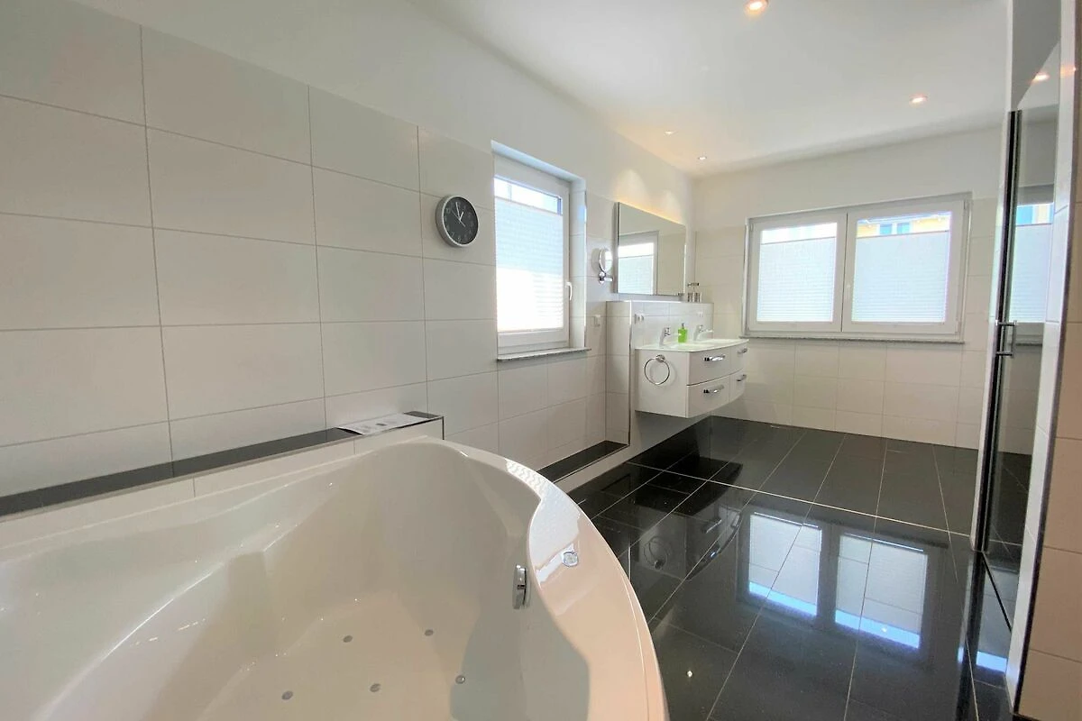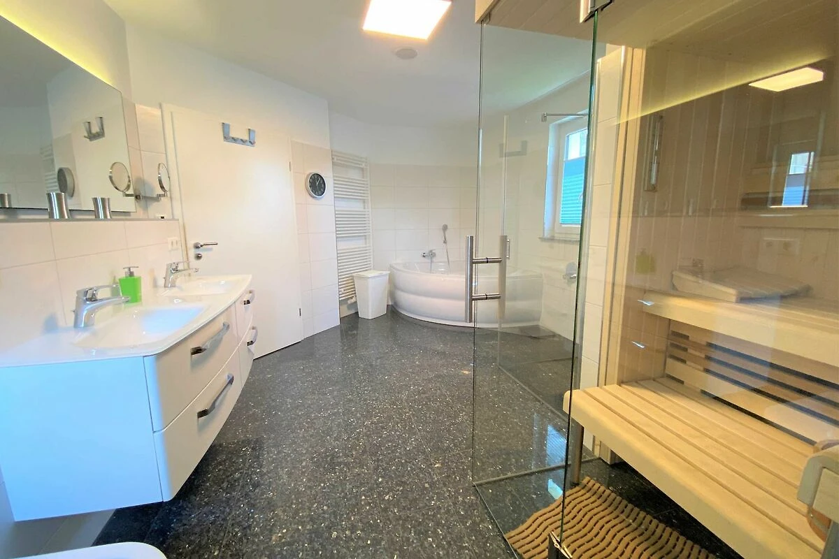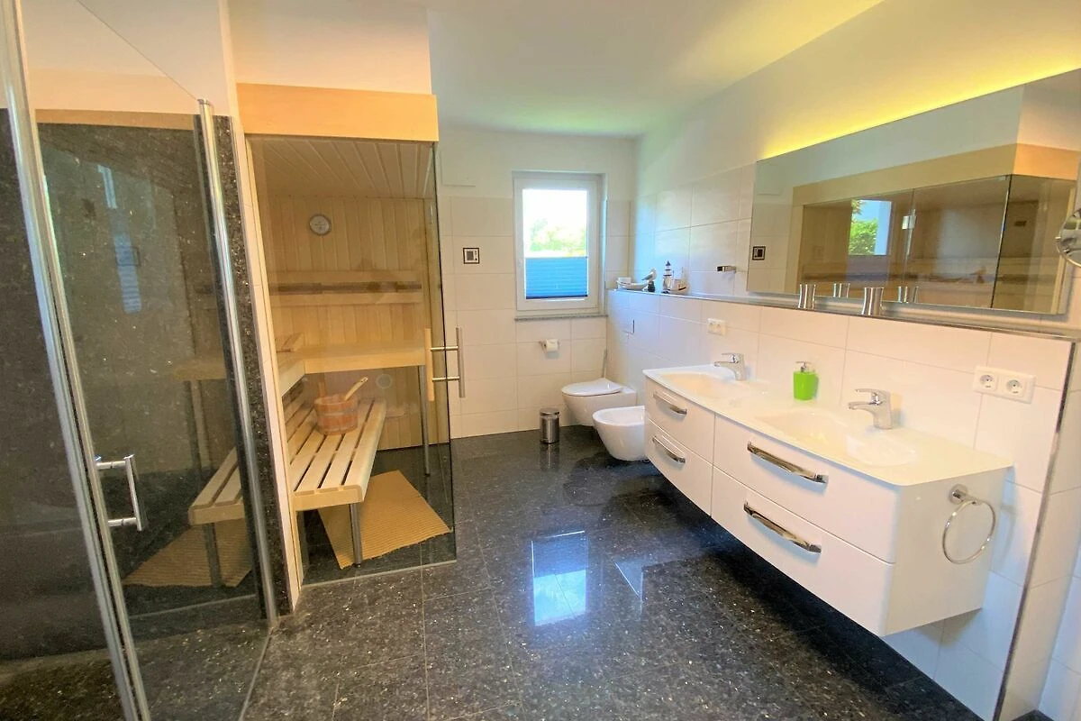 Im Ferienhaus Corvin befinden sich vier modern eingerichtete Schlafzimmer mit jeweils einem Doppelbett. Zwei der drei Bäder sind mit Whirlpools ausgestattet, auch eine Sauna ist im Ferienhaus vorhanden.