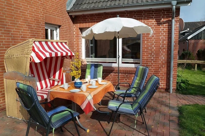 Strandkorb, Gartenmöbel, Terrasse, grosser eigener Garten mit Gartenhaus, Gartengrill, Fahrradabstellmöglichkeit im Gartenhaus,