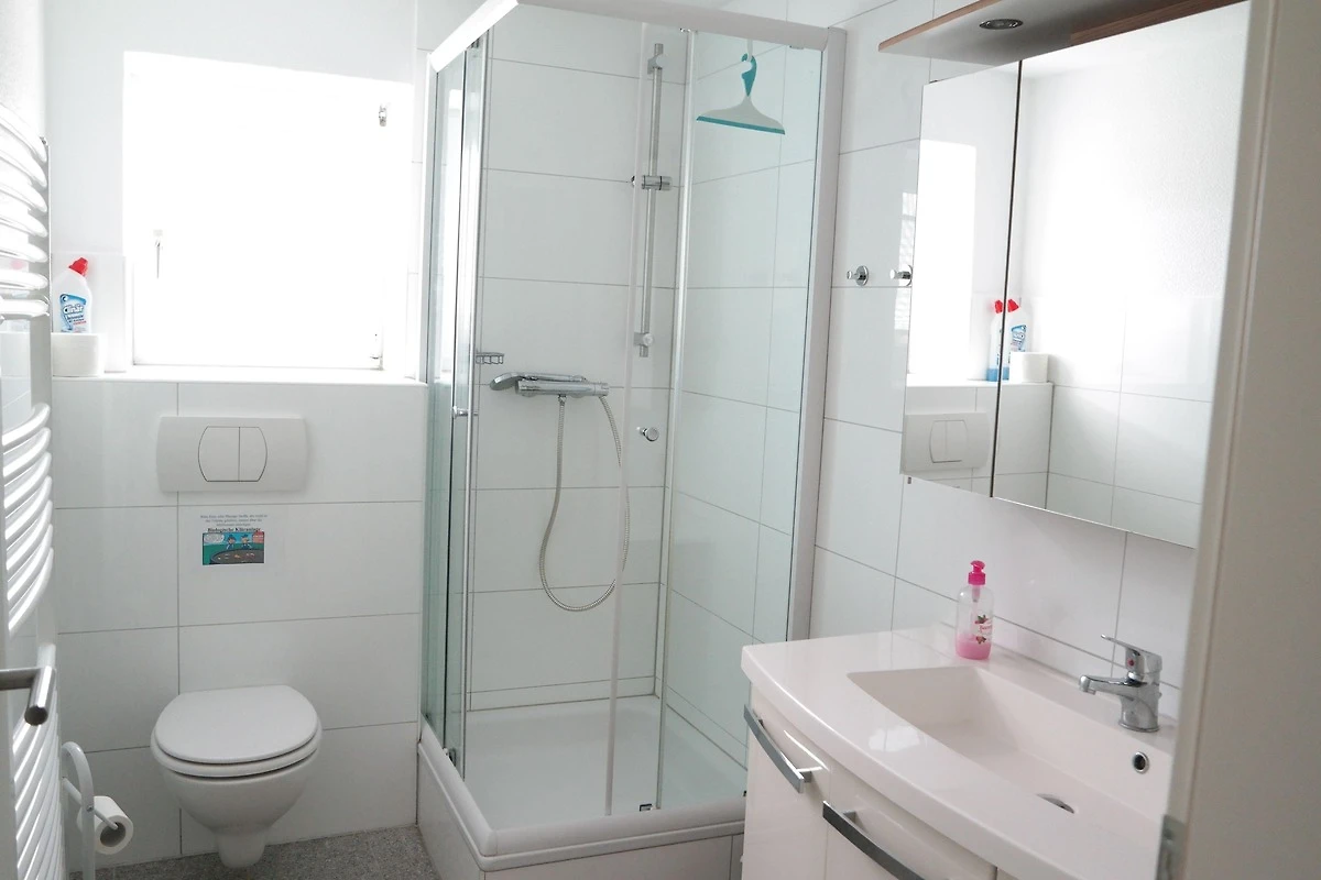 Bad 2: Dusche, WC, moderner Badblock, w/k, Fussbodenheizung, Handtuchwärmer