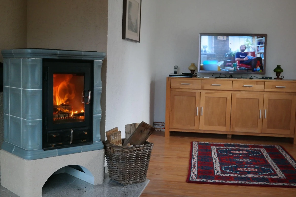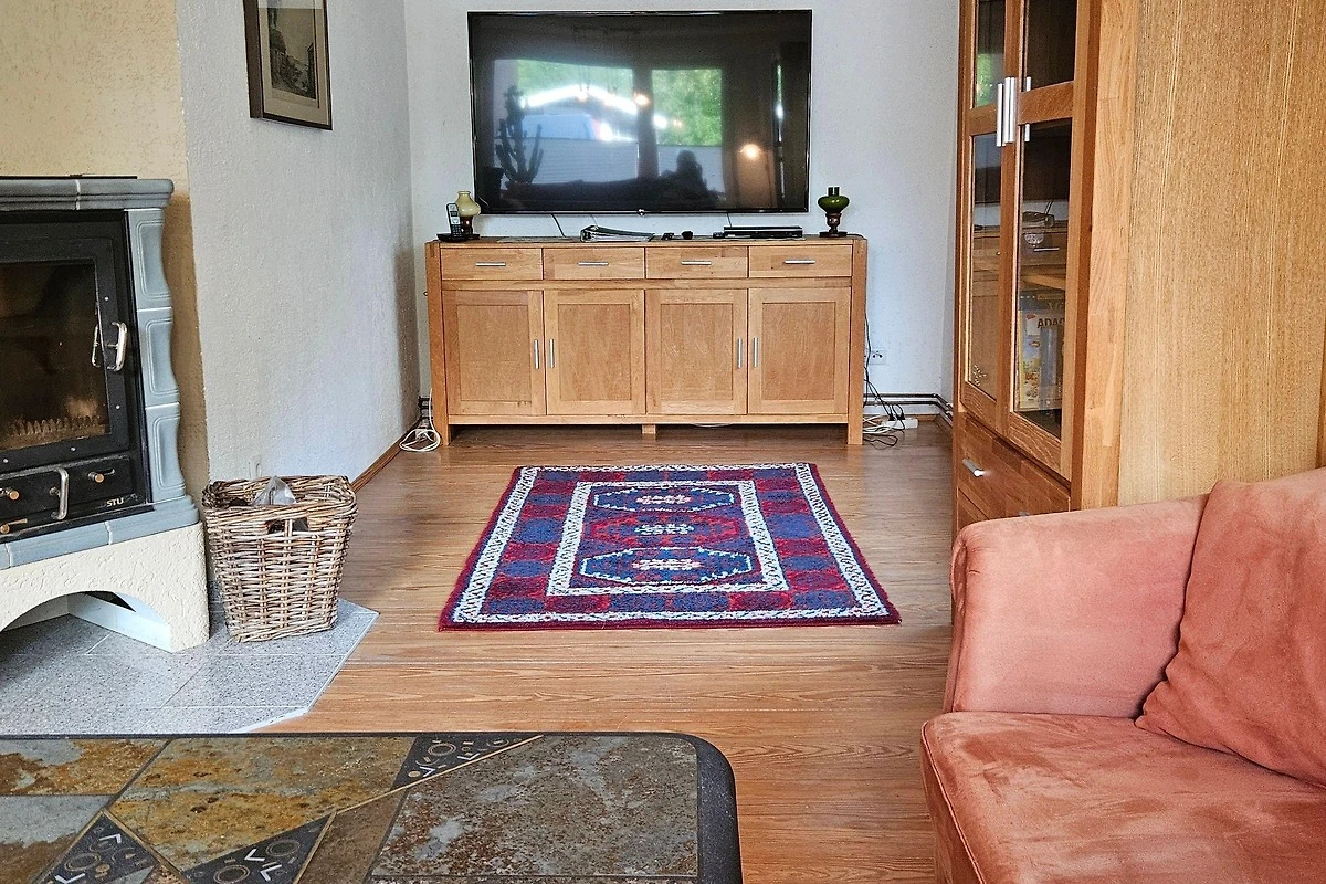 Wohnzimmer: gemütlich eingerichtetes Wohnzimmer mit Kaminofen,