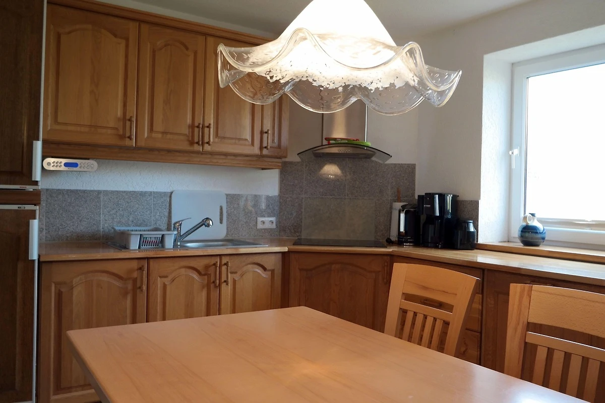 Geschirrspüler, Spüle, w/k, Kaffeemaschine, Wasserkocher, Essbereich mit Eckbank und Stühlen