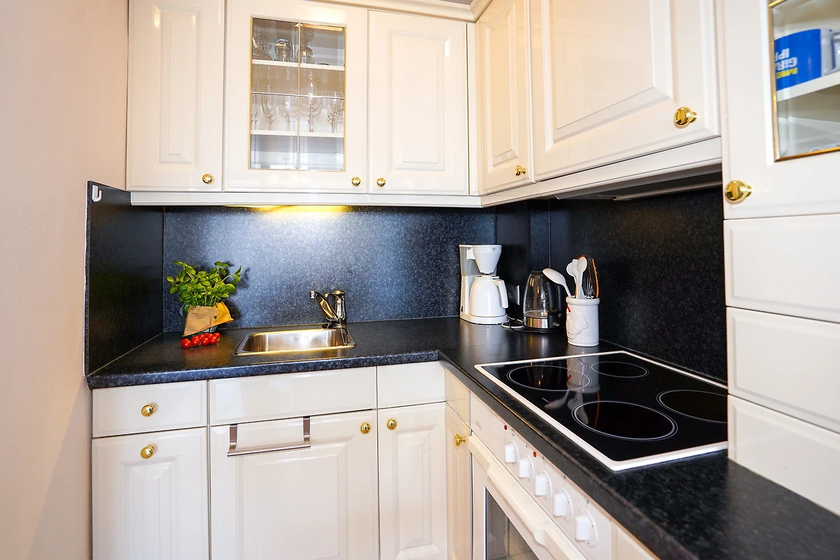 Die offene Pantryküche mit Kühlschrank, Backofen, Ceranfeld, Mikrowelle mit Backfunktion, Toaster, Kaffeemaschine und Wasserkocher lässt keine Wünsche offen. Angrenzend an die Küche erwartet Sie ein kleiner Tresen für das schnelle Frühstück oder einen Kaffee zwischendurch.