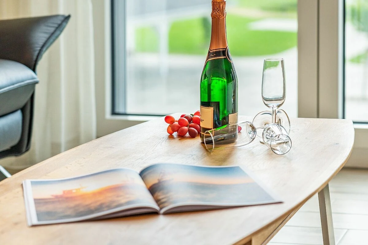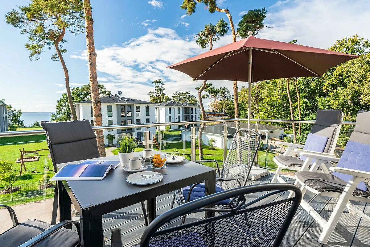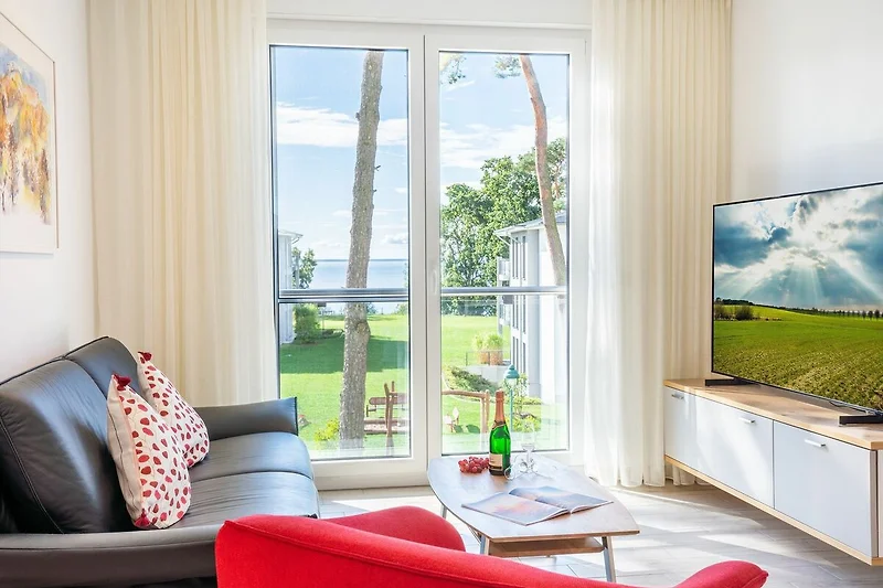 Der offen gestaltete Wohnbereich ist mit einem komfortablen Sofa und Sessel sowie Smart-TV ausgestattet. Sie haben vom Wohnzimmer aus Zugang zum Südwest-Balkon. Der möblierte Balkon mit traumhaften Ausblicken auf das Stettiner Haff bietet auch aus der zweiten Reihe einen wunderschönen Ort, um Ihre Mahlzeiten zu geniessen und die Aussicht zu bewundern.