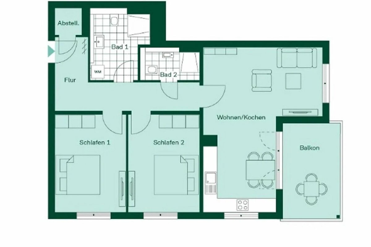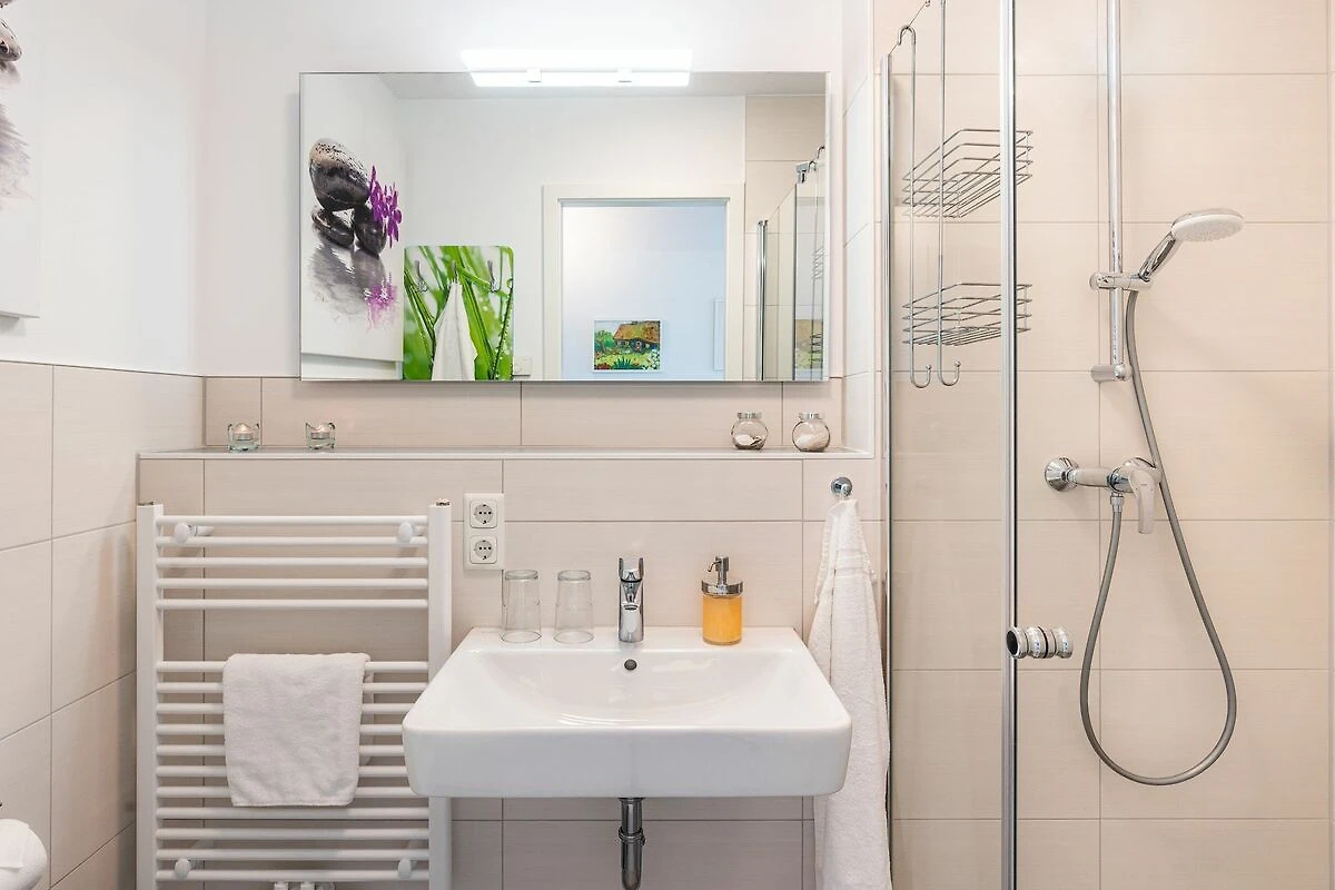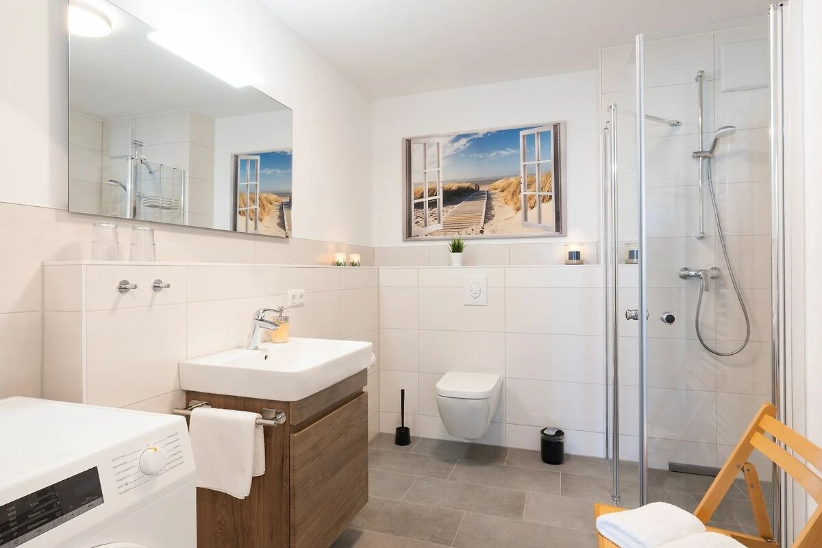 Die beiden vollausgestatteten Badezimmer verfügen jeweils über eine ebenerdige Dusche, WC, Waschtischanlage sowie Fön.