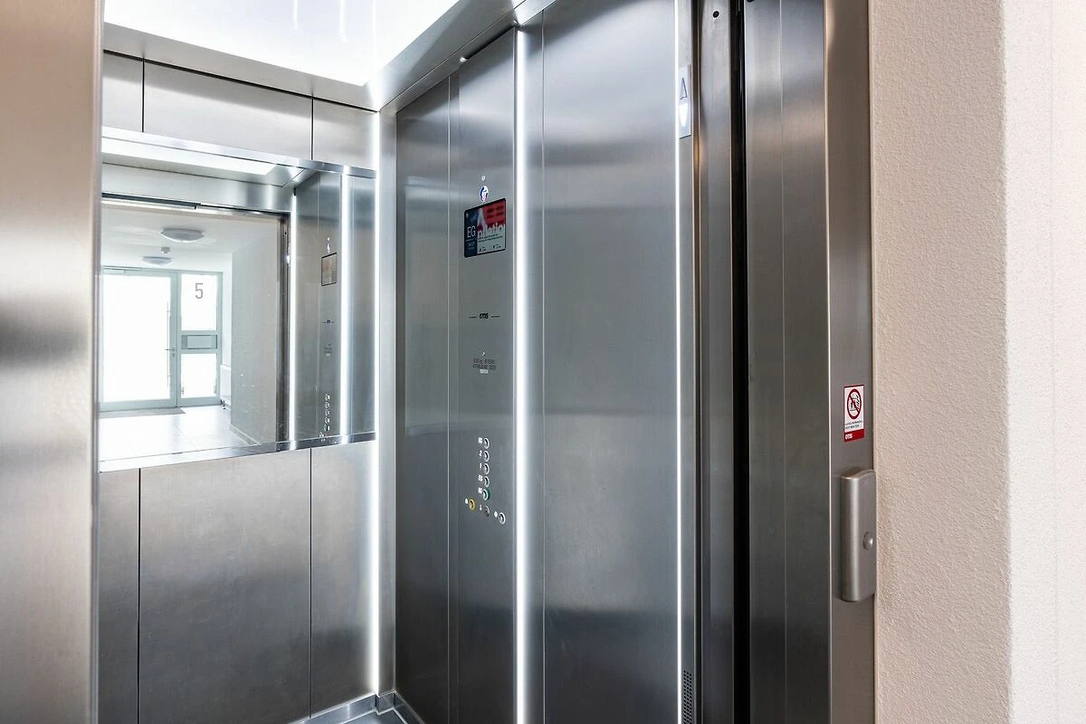 Informationen für Gäste mit Mobilitätseinschränkung: Der Zugang vom Parkplatz zum Hauseingang ist barrierefrei. Die Distanz vom Parkplatz zur Haustür beträgt etwa 30 Meter. Die Breite der Haustür beträgt 100 cm. Die Dichtigkeitsschwelle der Haustür ist etwa 1,5 cm hoch. Der Aufzug im Treppenhaus fährt jede Etage, auch die Saunalandschaft im Obergeschoss, an. Die Türbreite des Aufzugs beträgt 90 cm, die Tiefe beträgt 130 cm. Die Wohnungstür weist eine Breite von 90 cm auf. Die Breiten der Zimmertüren liegen bei 80 cm (Ausnahme: Türbreite von der Abstellkammer beträgt 70 cm). Im Badezimmer beträgt die Breite des Duscheingangs etwa 100 cm (faltbare Duschtür). Die Duschkabine hat eine Masse von 120 x 120 cm. Auf Wunsch kann ein Duschhocker kostenfrei zur Verfügung gestellt werden. Der Waschtisch ist unterfahrbar. Haltegriffe sind nicht vorhanden. Das Bett weist eine Höhe von 55 cm auf und ist nicht unterfahrbar. Die Terrassentür im Wohnzimmer ist zweiflügelig und lässt sich auf eine Breite von etwa 160 cm öffnen. Im Schlafzimmer lässt das an der Terrassentür befindliche Fliegengitterschiebeelement die Tür auf eine Breite von etwa 70 cm öffnen. Die Schwelle von der gepflasterten Terrasse zur Rasenkante beträgt etwa 15 cm. Der Saunabereich im Dachgeschoss ist mit dem Aufzug erreichbar. Im Dachgeschoss ist eine Sauna mit dem Rollstuhl befahrbar, die Türbreite beträgt 90 cm. Für das Betreten der Dachterrassen müssen zwei Stufen passiert werden. Das Betreten des Südbalkons im Dachgeschoss ist barrierefrei möglich. Die Freizeitbereiche im Untergeschoss des Nachbarhauses sind komplett barrierefrei gestaltet. Die Türbreiten liegen bei 90 cm.