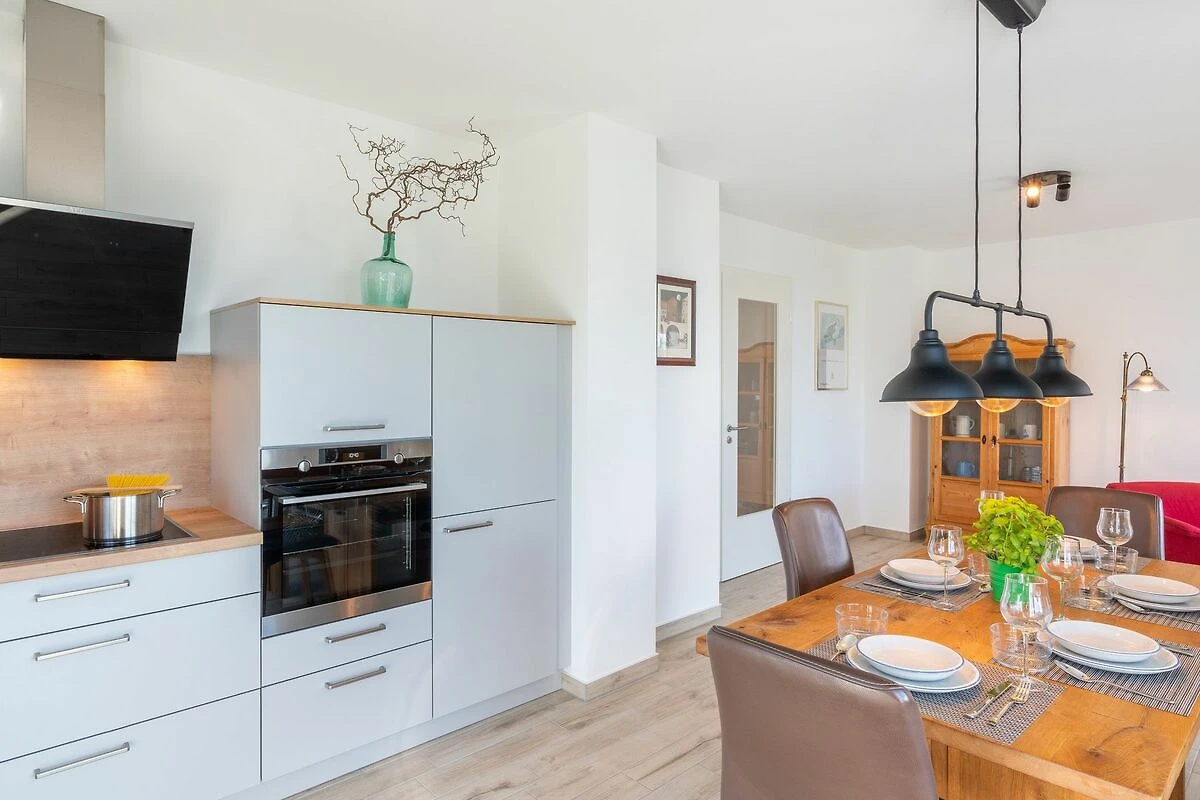 Die Küchenzeile verfügt über hochwertige Geräte wie Herd, Backofen, Kaffeemaschine, Kühl- und Gefrierschrank sowie Spülmaschine. Ausreichend Geschirr, Besteck sowie Töpfe und Pfannen befinden sich in den Schränken. Am grossen Esstisch finden Sie vor einem erholsamen Urlaubstag zu einem gemeinsamen Frühstück zusammen.