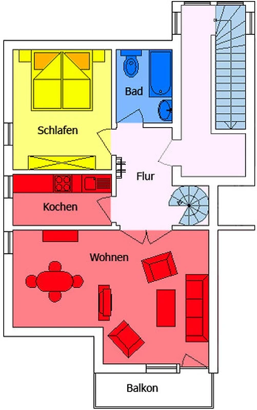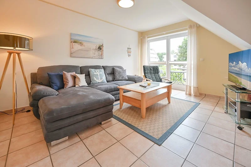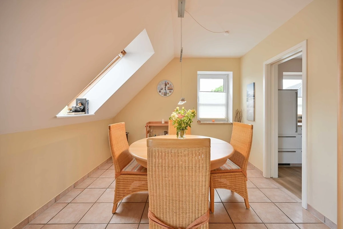 Die Ferienwohnung von Familie Goos im Ostseebad Kellenhusen verfügt über ein geräumiges, helles Wohnzimmer mit Sofalandschaft und Essbereich für 6 Personen sowie Zugang zum möblierten Balkon. Die separate Küche ist mit dem Wohn-Essbereich durch eine Schiebetür verbunden. Im Flur finden Gäste eine Garderobe und eine Wendeltreppe, die ins zweite Obergeschoss führt. Die Wohnung verfügt über ein separates Schlafzimmer mit Doppelbett (160 x 200), Nachttischen und grossem 3-türigen Kleiderschrank.