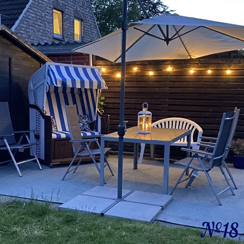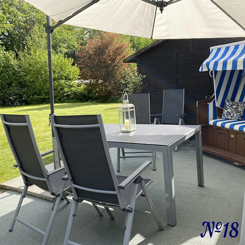 Auf der grossen Wiese hinter dem Haus finden Sie eine Sitzecke mit Strandkorb, einem grossen Sonnenschirm und Gartenmöbeln zum Relaxen. Für die Kleinen befindet sich dort ein Sandkasten mit etwas Sandspielzeug.