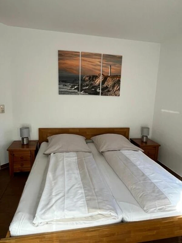 2 Schlafräume (1*Doppelbett 1,80m x2m (neue Matratzen im April 2022) und 1* ein Hochbett (unteres Bett 1,40 m x 2,00 m (neue Matratze im Mai 2023, Rausfallschutz zum Montieren vorhanden), oberes Bett 0,90m x 2,00 m (neue Matratze im Oktober 2023)). Es befindet sich ein zweites Fernsehgerät im Schlafzimmer mit Doppelbett. Beide Schlafräume und der Flur sind mit Rauchmeldern ausgestattet. Dusche-WC mit Waschmaschine.