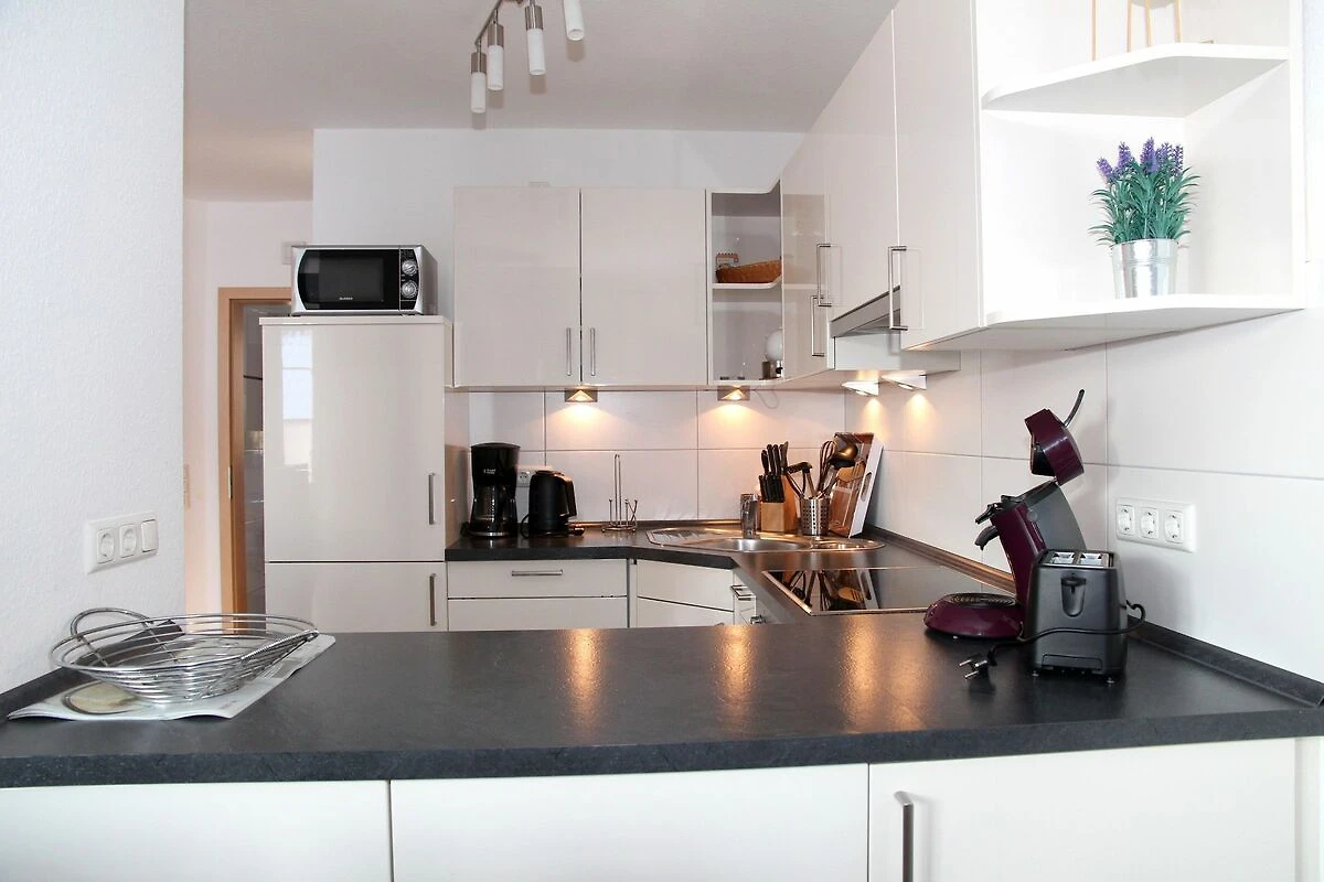 Ein Kamin sorgt für wohlige Wärme im offenen Wohn- Essbereich, das an der Ausstattung keine Wünsche offen lässt - Mikrowelle, Backofen, Geschirrspülmaschine, Kühl- Gefrierkombination, Kaffeemaschine und Kaffepadmaschine, Wasserkocher, Eierkocher, Toaster, Waschmaschine, Trockner u.v.m.