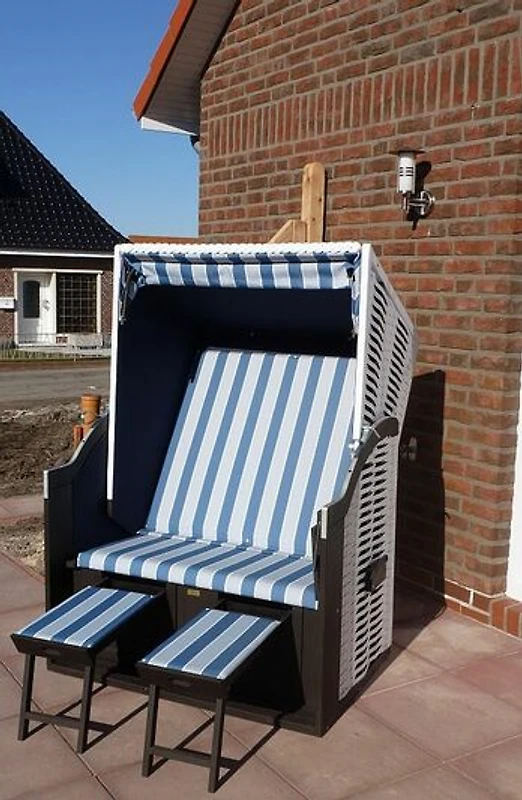 Eine schöne, große und möblierte Terrasse mit Strandkorb und zwei Gartenliegen lädt zum Verweilen ein. Es gibt ein Gartenhaus mit Platz zum Abstellen mitgebrachter Fahrräder und einen Stromanschluss.