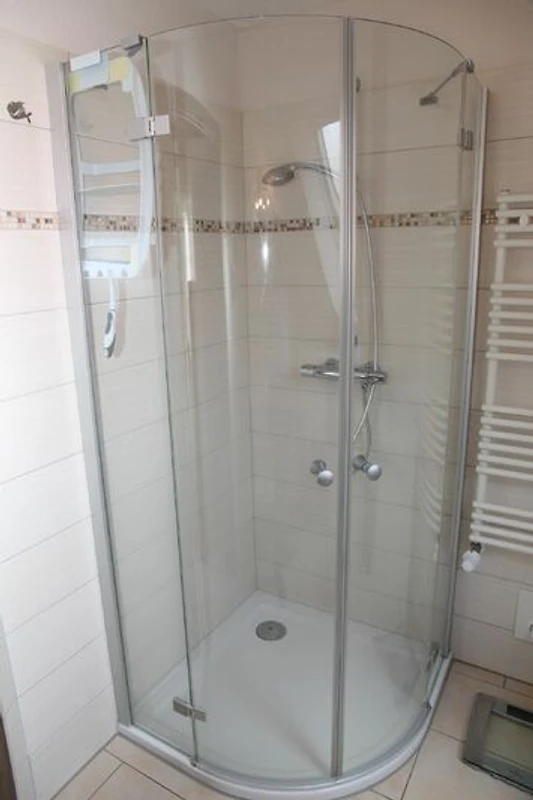 Es gibt ein komfortables Duschbad mit Handtuchtrockner und Waschmaschine.