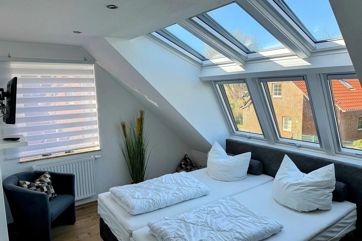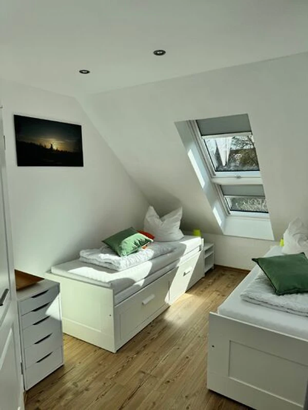 Das Ferienhaus (Nichtraucher!) verfügt über 3 Schlafzimmer (Doppelbett + 2 Einzelbetten (die jeweils zum Doppelbett ausgezogen werden können)) die sich im 1. Stock befinden. Im Jahr 2026 wurden beide Schlafzimmer im 1. OG mit neuen und deutlich größeren Veluxfenstern ausgestattet, die für eine tolle Lichtdurchflutung und einen schönen Wasserblick in dem Doppelbett-Zimmer sorgen. Das 3. Schlafzimmer befindet sich in der ausgebauten Galerie unterm Dach. In allen 3 Schlafzimmern gibt es einen Fernseher. Das große Veluxfenster in der Galerie ist mit einem Verdunklungsrollo ausgestattet. Auch die anderen beiden Schlafzimmer verfügen über Verdunklungsmöglichkeiten und hier ist mindestens 1 Fliegengitter pro Schlafzimmer vorhanden.