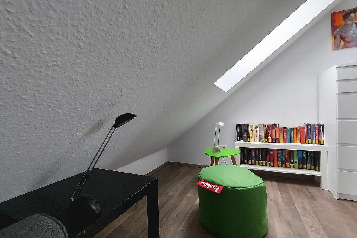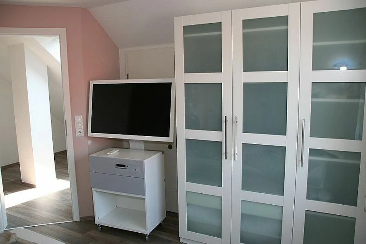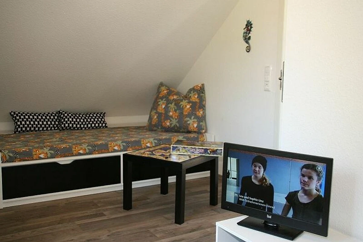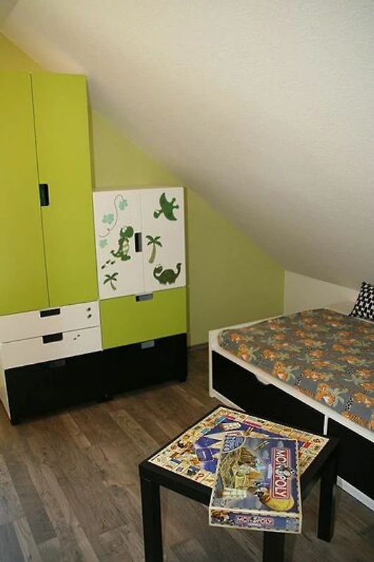Das dritte Schlafzimmer ist möbliert mit 2 Einzelbetten (eines mit verstellbarem Lattenrost und speziell Rücken schonender thermosensibler Matratze). Hier finden kleine Gäste Spiele und Bücher vor sowie ein SAT-TV mit integriertem DVD-Player. Auch ein Kinderreisebett ist vorhanden.