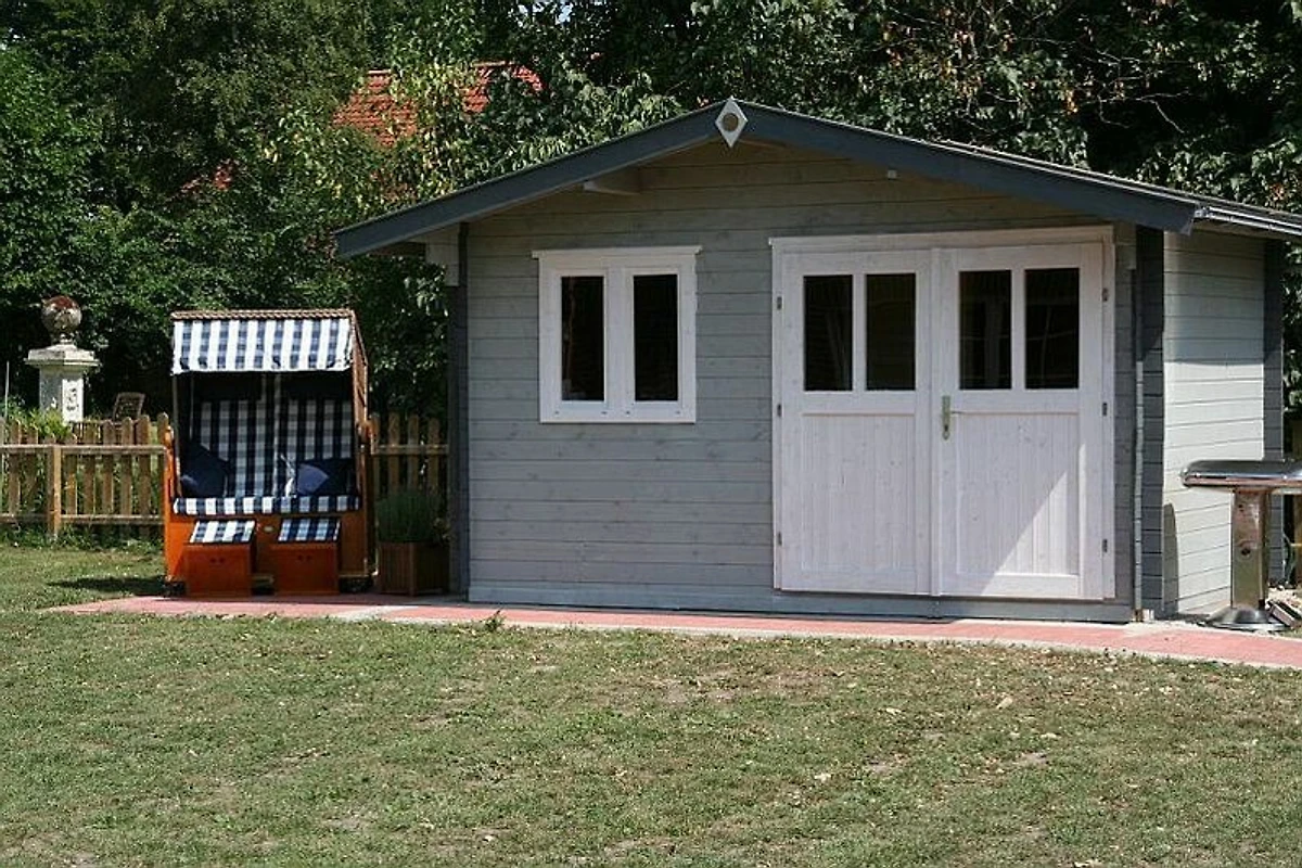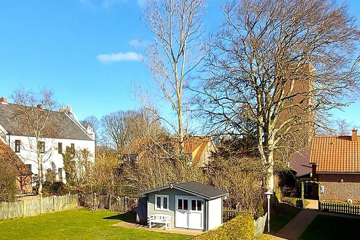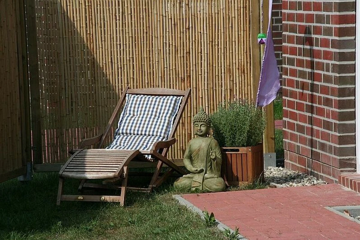 Der geschlossene Garten zur Alleinnutzung und die große Terrasse mit Blick auf den historischen Löwenhof sind mit einem Gartenmöbelset (Holztisch mit Bank, Stühlen und Kissenauflagen), Sonnenschirm, 2 Saunaliegen, und Grill ausgestattet. Hier können Sie in der Morgensonne frühstücken, den Tag genießen oder den Abend nach einem Strandtag in Ruhe ausklingen lassen. Die Sonnenterrasse am Gartenhaus mit Bistro-Tischgarnitur und Strandkorb bietet Gelegenheit, windgeschützt die letzten Sonnenstrahlen zu genießen.
