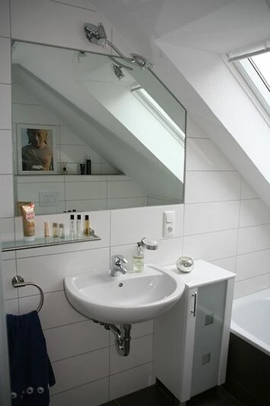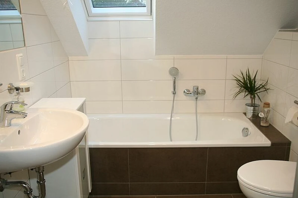 Das zweite Bad im OG mit einer Badewanne und einer Dusche mit niedrigem Einstieg verfügt über ein weiteres WC und ist ebenfalls mit Fußbodenerwärmung und Handtuchtrockner ausgestattet. Ein Föhn ist in beiden Bädern vorhanden.