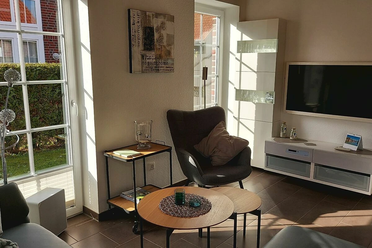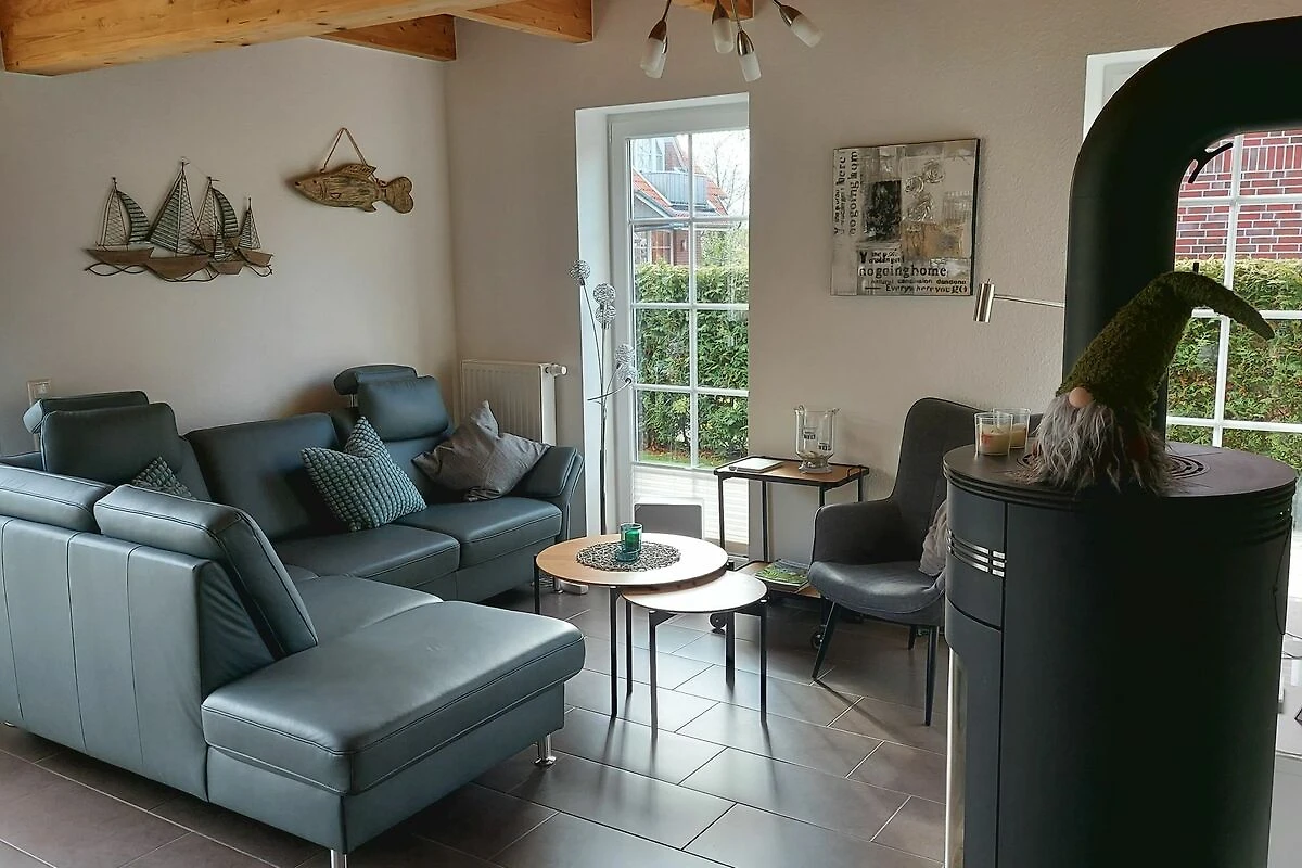 Das frei stehende Friesenhaus für 6 Personen und ein Kleinkind ist im modernen Landhausstil gehalten mit Holzbalkendecke und großem Kaminofen.