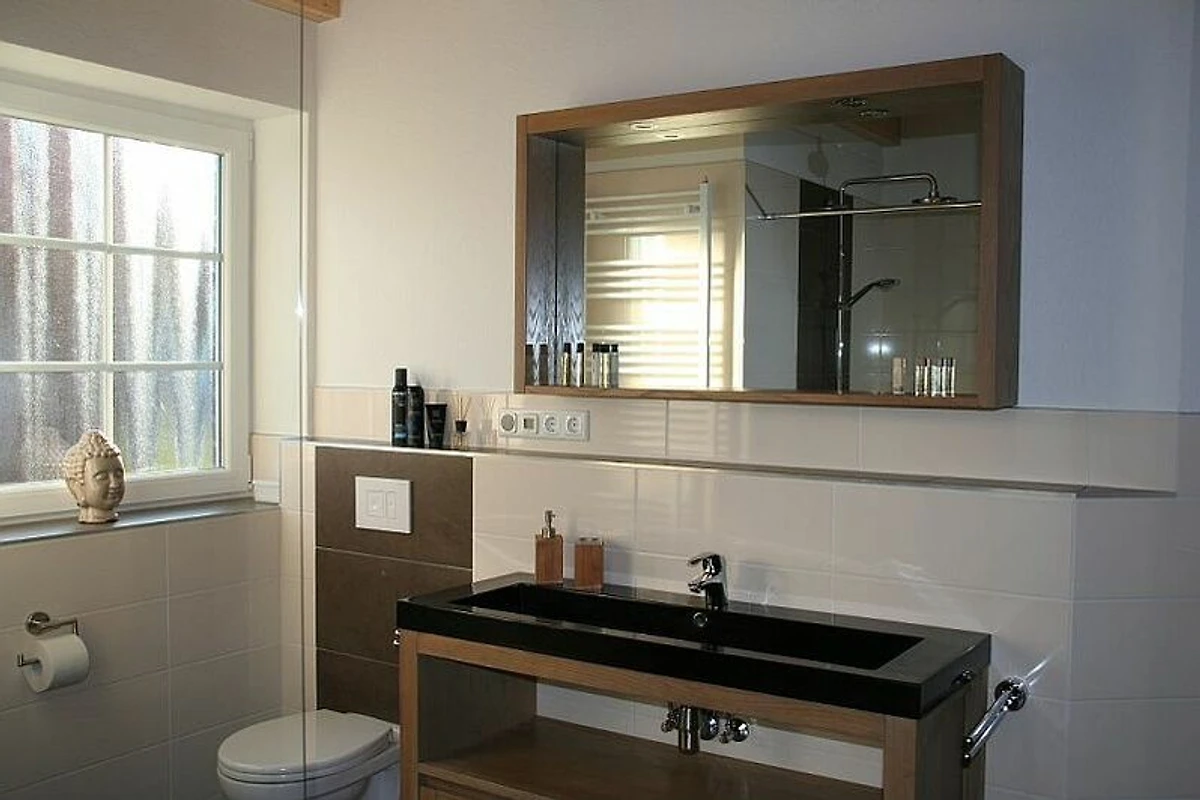 Im Wellness-Bad mit eingebautem Radio, Fußbodenerwärmung, Handtuchtrockner und ebenerdiger (barrierefreier) Regenschauer-Dusche befindet sich auch die Bio-Sauna, die wahlweise als klassisch finnische Sauna oder als Dampfsauna genutzt werden kann. Das geräumige Bad mit Sauna und Gartenzugang auf eine kleine Sauna-Terrasse lädt ganzjährig zu Wellness und Entspannung ein.
